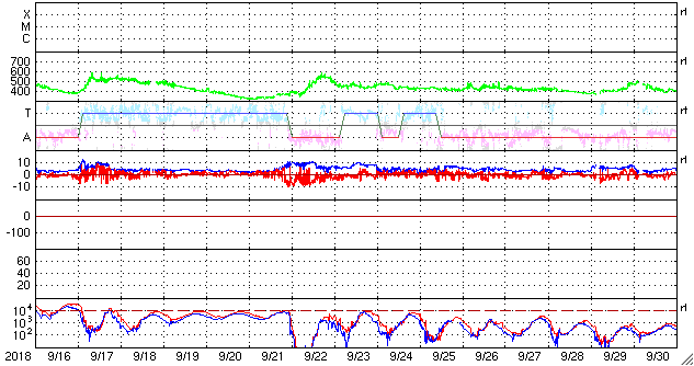 - 2018/10/14 13:03 太陽風の速度が高まり、磁気圏活動の高まりも発生しています。