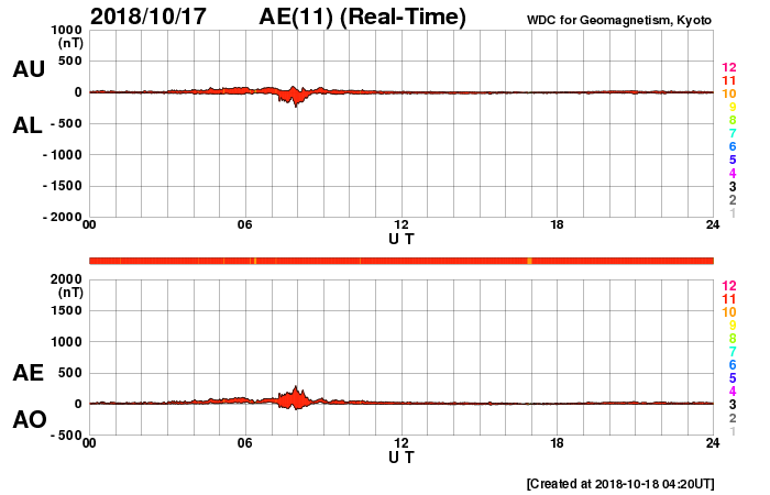 下段のAEグラフの値が高くなると、オーロラ活動が活発化しています。