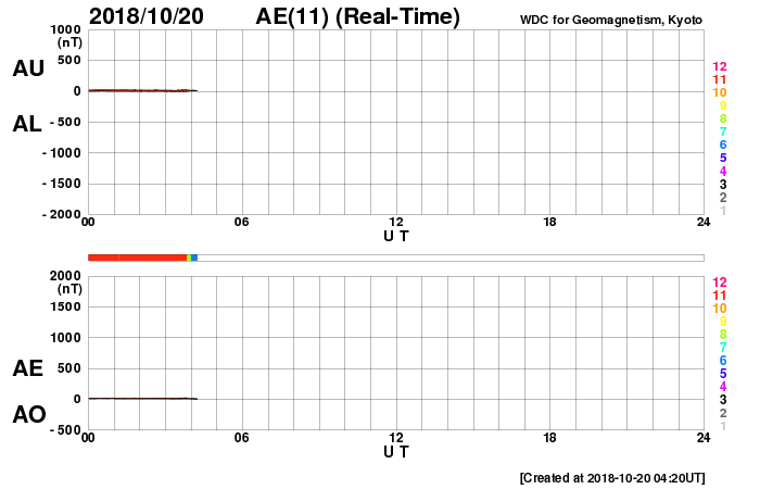 下段のAEグラフの値が高くなると、オーロラ活動が活発化しています。