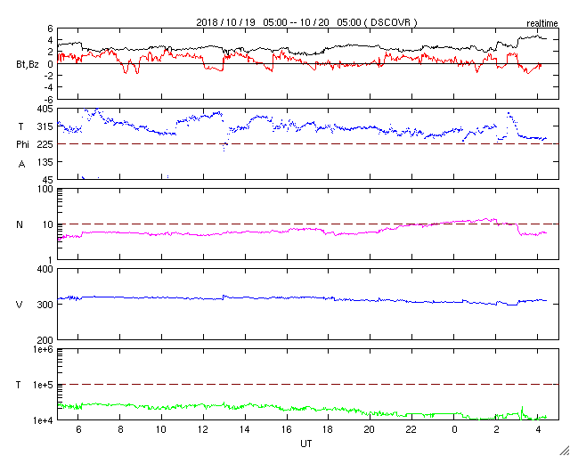 - 2018/10/18 13:21 太陽風はやや低速になっています。太陽は無黒点です。