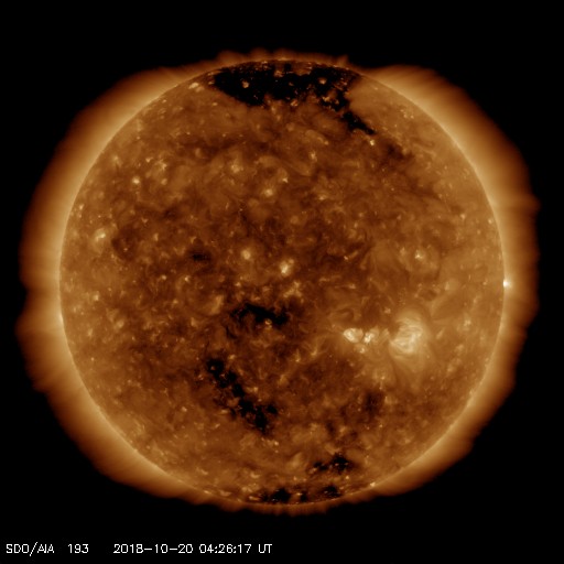 - 2018/10/17 12:41 高速太陽風は終わりかけています。太陽に小さい黒点が見えています。