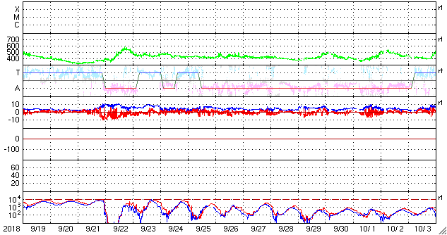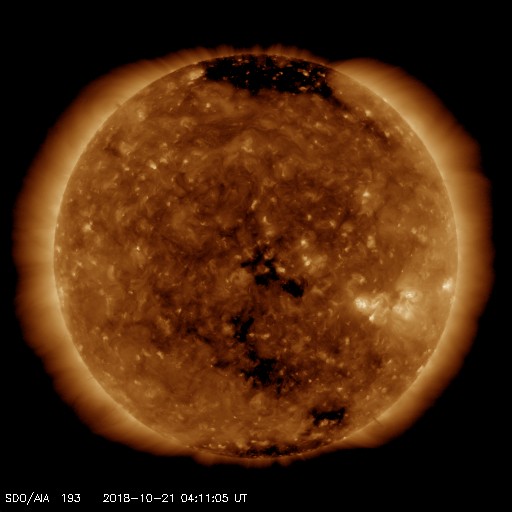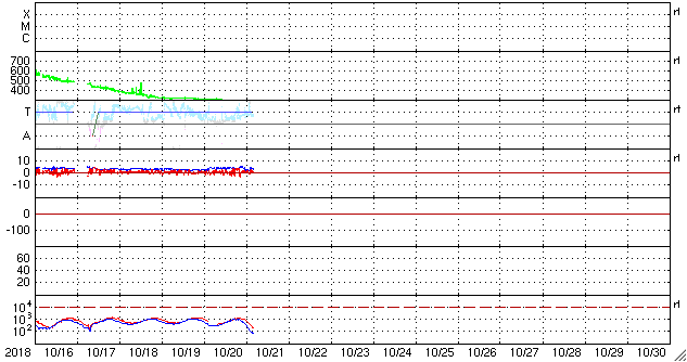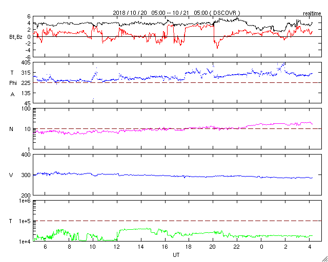 2018/10/21 13:29 更新 太陽風はかなり低速になっています。太陽に黒点が現れています。 担当 篠原 太陽風の速度は、300km/秒から280km/秒へ下がり、 かなり低速になっています。 磁場強度も、3〜4nTとやや弱い状態が続いています。 太陽風磁場の南北成分は、 0nT付近で小さく南北に変化しています。 速度が下がっていることもあり、磁気圏は静穏で、 AE指数のグラフは、小さい変化が起きている程度です。 27日周期の図の前周期の9月22日に始まった太陽風の高まりは、 今回は到来しなかった様です。 SDO衛星AIA193では、南半球に淡いコロナホールが見えています。 2〜3日後に、次の太陽風の変化をもたらすかもしれません。 太陽では、西側(右側)に小さい黒点が現れています。 以前見えていた2724群と2725群の間に出現した様に見えますが、 どちらかの群の黒点かもしれません。 ![]() SDO衛星のAIA193カメラによる太陽コロナの様子 (c) SDO (NASA) ![]() SDO衛星による太陽の可視光写真。マウスの矢印を写真に重ねると、黒点番号付きの写真に切り替わります。 (c) SDO (NASA) ![]() DSCOVRが観測した太陽風の磁場(1番上の枠、黒線は全体の強度、赤線は南北成分) および、太陽風の密度(3番目の紫線)、速度(4番目の青線) (c) データ:NOAA/SWPC、作図:宇宙天気ニュース ![]() AE指数(速報値) 下段のAEグラフの値が高くなると、オーロラ活動が活発化しています。 (c) 京都大学WDC ![]() ![]() 27日の太陽周期に合わせたデータプロット 太陽が同じ面を地球に向けていた27日前の変化から、今後を予想することができます。 (c) 作図:宇宙天気ニュース