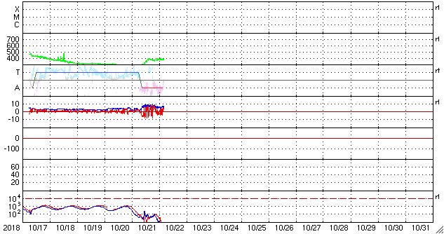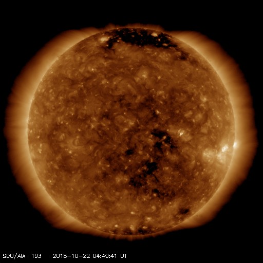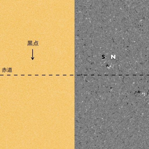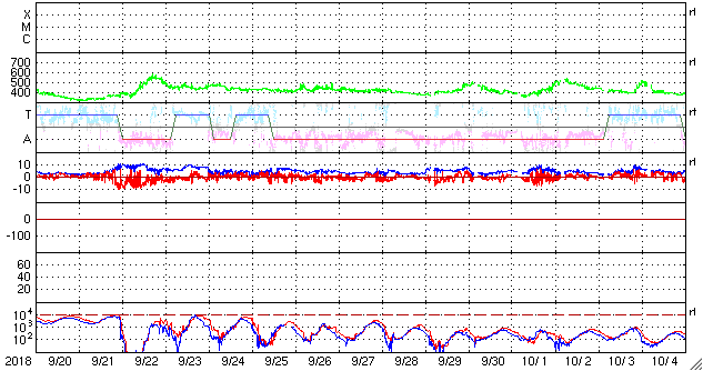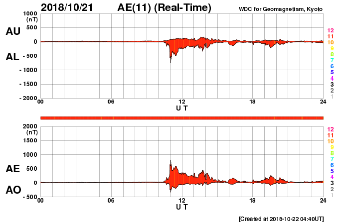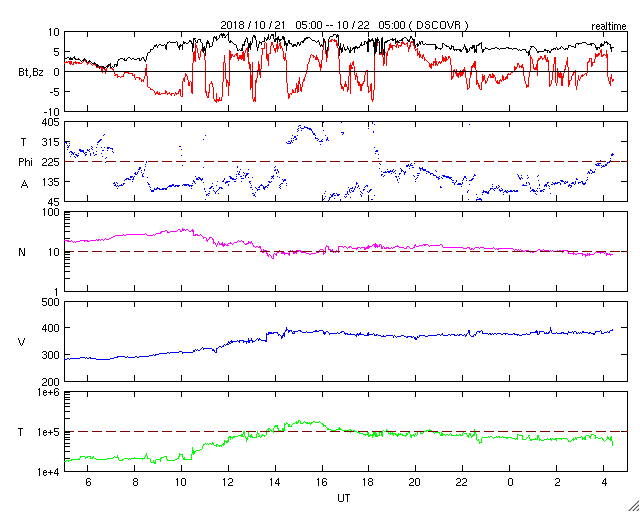 2018/10/22 13:50 更新 太陽風に弱い変化が到来しています。太陽に小さい黒点が発生しています。 担当 篠原 昨夕、21日17時(世界時21日8時)頃から、 太陽風の磁場強度が3nTから8nTに高まり、 速度も、280km/秒から380km/秒に高まる変化が発生しました。 変化の大きさとしては小規模で、磁場はやや強まった程度、 速度はやや低速に戻った態度です。 27日周期の図を見ると、 太陽風磁場の大まかな方向が切り替わるセクター境界を通過したため、 太陽風の変化が発生した様です。 この変化に伴って、 太陽風磁場の南北成分は南北に大きく振れ、 磁気圏の活動を一時的に高めました。 21日のAE指数のグラフの中央部に、 700nTに達する中規模の変化が発生しています。 太陽風の速度は遅かったので、 活動の規模はあまり大きくならなかった様です。 太陽風磁場の南北の変化は、小さくなりながら続いています。 磁気圏もやや活動的な状態が続いています。 太陽では、掲載の可視光写真ではほとんど見えませんが、 西側(右側)の赤道付近に、小さい黒点が発生しています。 今朝早く見え始めた様です。 黒点は赤道から少し北側に発生していますが、 磁場の分布が、現在の北半球の並びと反対になっている様です (第24期の南半球型、もしくは、次の第25期の北半球型)。 赤道に近いことから、第24期の黒点に属すると思われますが、 最近、この様な微妙な黒点が時々現れています(8月24日の記事)。 また、昨日太陽の南西側に見えていた小さい黒点は、 現在はほとんど見えなくなっています。 ![]() SDO衛星による、太陽の西寄りの黒点の可視光(左)と磁場分布(右)の写真。 (c) SDO (NASA)、作図:宇宙天気ニュース ![]() SDO衛星のAIA193カメラによる太陽コロナの様子 (c) SDO (NASA) ![]() SDO衛星による太陽の可視光写真。マウスの矢印を写真に重ねると、黒点番号付きの写真に切り替わります。 (c) SDO (NASA) ![]() DSCOVRが観測した太陽風の磁場(1番上の枠、黒線は全体の強度、赤線は南北成分) および、太陽風の密度(3番目の紫線)、速度(4番目の青線) (c) データ:NOAA/SWPC、作図:宇宙天気ニュース ![]() AE指数(速報値) 下段のAEグラフの値が高くなると、オーロラ活動が活発化しています。 (c) 京都大学WDC ![]() ![]() 27日の太陽周期に合わせたデータプロット 太陽が同じ面を地球に向けていた27日前の変化から、今後を予想することができます。 (c) 作図:宇宙天気ニュース