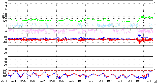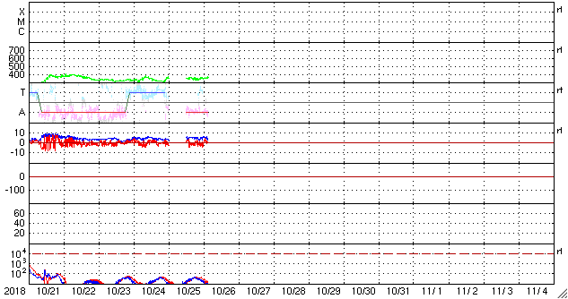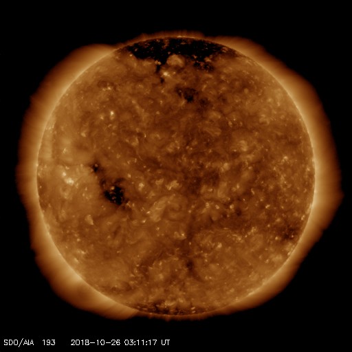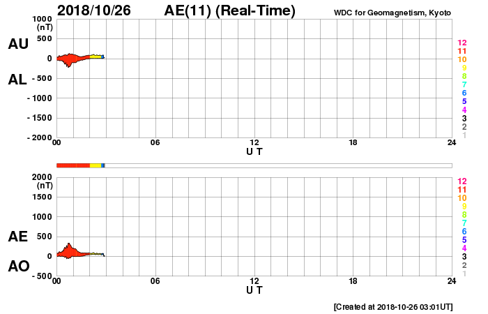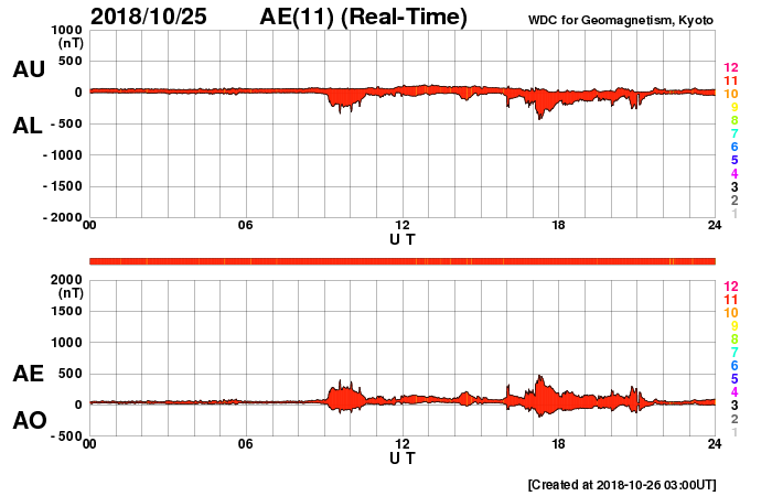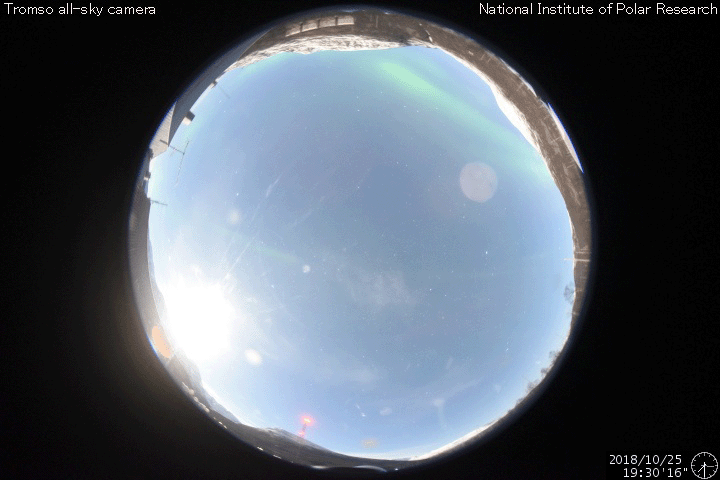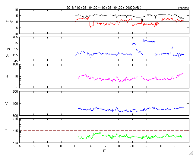 2018/10/26 12:27 更新 低速の太陽風が続いています。 担当 篠原 太陽風は、350km/秒と低速の状態が続いています。 磁場強度は、5nTと平均的な値に戻っています。 全体としては、穏やかな風が続いています。 磁場の南北成分は、変化は小さいですが、 南寄りになっている時間帯があります。 この頃に磁気圏では小規模の活動が起きていて、 AE指数は、300nT前後の変化がしばらく続いています。 世界時25日19時半〜21時の ノルウェー・トロムソの全天カメラの動画を掲載します。 月が大きいため、空の条件は厳しいですが、 オーロラの帯が夜空を飾っています。 SDO衛星AIA193では、太陽の東側(左側)の赤道域に、 コロナホールが見えています。 今のところ、前周期よりも広がりが小さくなっている様です。 前周期も目立った影響は来なかったので、 今回も特に変化はないままかもしれません。 太陽は無黒点で、穏やかです。 今日は文化祭・体育祭の設営を行っています。 明日、明後日と本番を迎えます。 ![]() ノルウェーのトロムソで全天カメラにより撮影された、世界時25日19時半〜21時のオーロラ。 (c) 国立極地研究所、(動画加工 : 宇宙天気ニュース) ![]() SDO衛星のAIA193カメラによる太陽コロナの様子 (c) SDO (NASA) ![]() SDO衛星による太陽の可視光写真 (c) SDO (NASA) ![]() DSCOVRが観測した太陽風の磁場(1番上の枠、黒線は全体の強度、赤線は南北成分) および、太陽風の密度(3番目の紫線)、速度(4番目の青線) (c) データ:NOAA/SWPC、作図:宇宙天気ニュース ![]() AE指数(速報値) 下段のAEグラフの値が高くなると、オーロラ活動が活発化しています。 (c) 京都大学WDC ![]() ![]() 27日の太陽周期に合わせたデータプロット 太陽が同じ面を地球に向けていた27日前の変化から、今後を予想することができます。 (c) 作図:宇宙天気ニュース