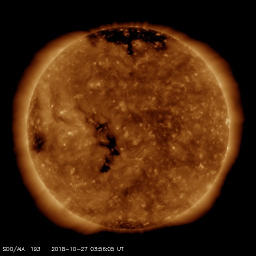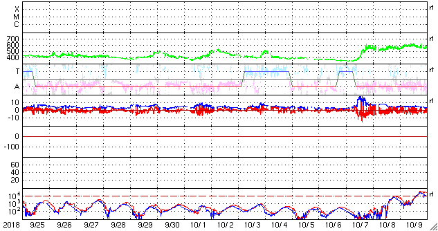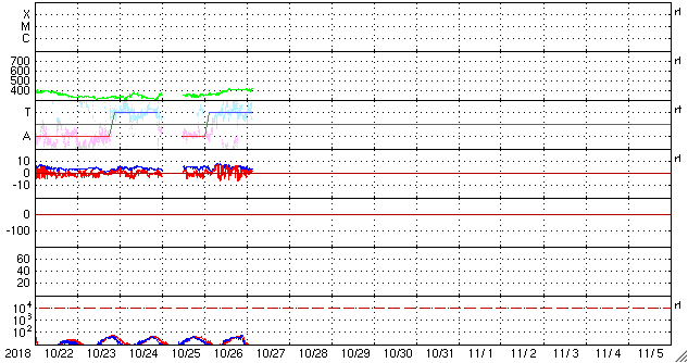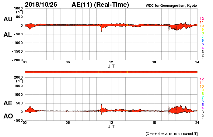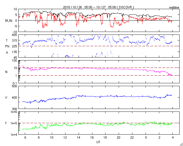 2018/10/27 13:10 更新 太陽風は平均的な速度に戻りました。磁気圏では小規模の活動が起きています。 担当 篠原 太陽風の速度は、350km/秒から400km/秒に少し上がり、 平均的な速さになっています。 磁場強度は、速度が高まる頃に7nTにやや強まりましたが、 現在は3nTとやや弱い程度に下がっています。 27日周期の図を見ると、 前周期の9月29〜30日に、 太陽風の速度が一時的に高まっています。 この変化が今回も到来したのかもしれません。 太陽風磁場の南北成分は、 時々、南向きに振れる変化をしています。 速度は遅めなので、活動としては小規模ですが、 AE指数は、300nTくらいの変化が度々発生しています。 前周期は、10月2日、10月3〜4日にも 太陽風の小さい高まりが起きています。 今回も、しばらく同様の変化が見られるかもしれません。 太陽は無黒点で穏やかです。 今日は鹿児島高専の文化祭です。 天気も良く、多くの方に来ていただいています。 今回は担当の関係で、朝5時半から学校に来ています。 お昼休みをもらって記事を書いています。 ![]() SDO衛星のAIA193カメラによる太陽コロナの様子 (c) SDO (NASA) ![]() SDO衛星による太陽の可視光写真 (c) SDO (NASA) ![]() DSCOVRが観測した太陽風の磁場(1番上の枠、黒線は全体の強度、赤線は南北成分) および、太陽風の密度(3番目の紫線)、速度(4番目の青線) (c) データ:NOAA/SWPC、作図:宇宙天気ニュース ![]() AE指数(速報値) 下段のAEグラフの値が高くなると、オーロラ活動が活発化しています。 (c) 京都大学WDC ![]() ![]() 27日の太陽周期に合わせたデータプロット 太陽が同じ面を地球に向けていた27日前の変化から、今後を予想することができます。 (c) 作図:宇宙天気ニュース