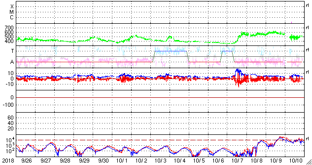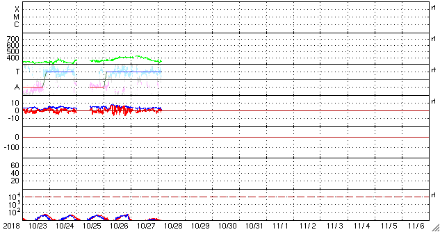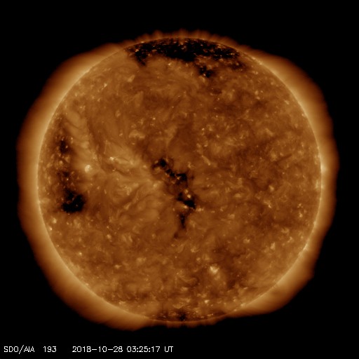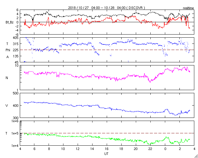 2018/10/28 12:40 更新 太陽風の速度は下がり、低速になっています。磁気圏は穏やかです。 担当 篠原 太陽風の速度は、340km/秒に下がり、 低速の状態に戻っています。 昨日の400km/秒への高まりは、 前周期と同様に一時的な変化だった様です。 太陽風の磁場強度は、 3nTとやや弱い状態で推移しています。 南北成分は、小さく南北に振れる程度です。 磁気圏は穏やかで、 AE指数は、300nTの小規模の変化が一時的に起きた程度です。 SDO衛星AIA193では、 太陽の中心部に細いコロナホールが見えています。 3日後の31日頃の太陽風に弱い変化が発生する可能性があります。 また、東端(左端)から新しいコロナホールが見え始めています。 これは、27日周期の図の前周期の10月7日(世界時)に始まる 太陽風の高まりをもたらした領域です。 次の到来は、一週間後の11月3〜4日頃になりそうです。 太陽は、無黒点が続いています。 今日は体育祭です。 午前中は曇っていて、寒いくらいでしたが、 順調に進行しています。 高専祭が終わると、秋の終わりを感じます。