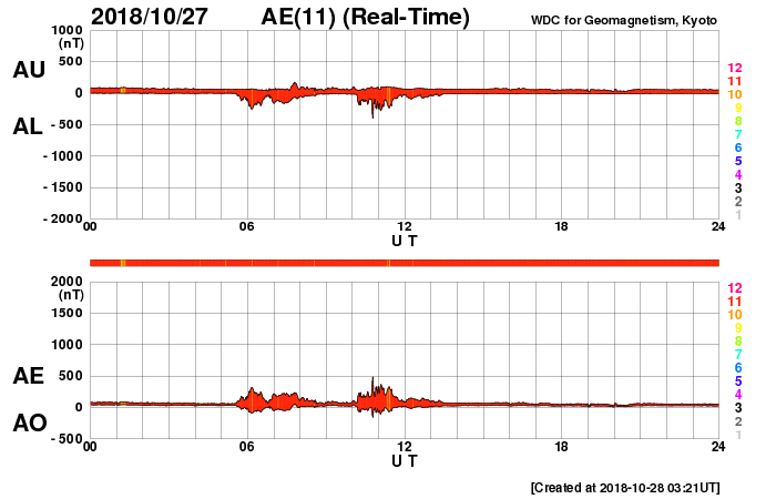 (c) SDO (NASA) ![]() SDO衛星による太陽の可視光写真 (c) SDO (NASA) ![]() DSCOVRが観測した太陽風の磁場(1番上の枠、黒線は全体の強度、赤線は南北成分) および、太陽風の密度(3番目の紫線)、速度(4番目の青線) (c) データ:NOAA/SWPC、作図:宇宙天気ニュース ![]() AE指数(速報値) 下段のAEグラフの値が高くなると、オーロラ活動が活発化しています。 (c) 京都大学WDC ![]() ![]() 27日の太陽周期に合わせたデータプロット 太陽が同じ面を地球に向けていた27日前の変化から、今後を予想することができます。 (c) 作図:宇宙天気ニュース