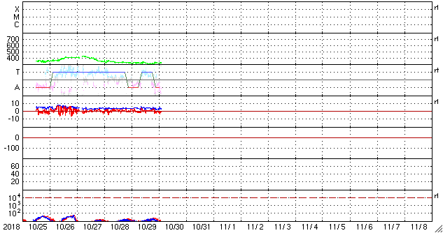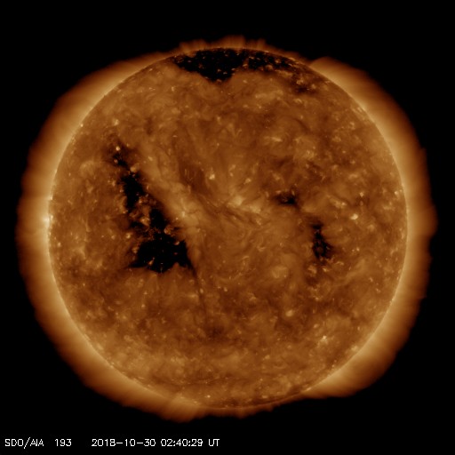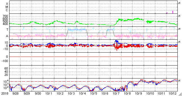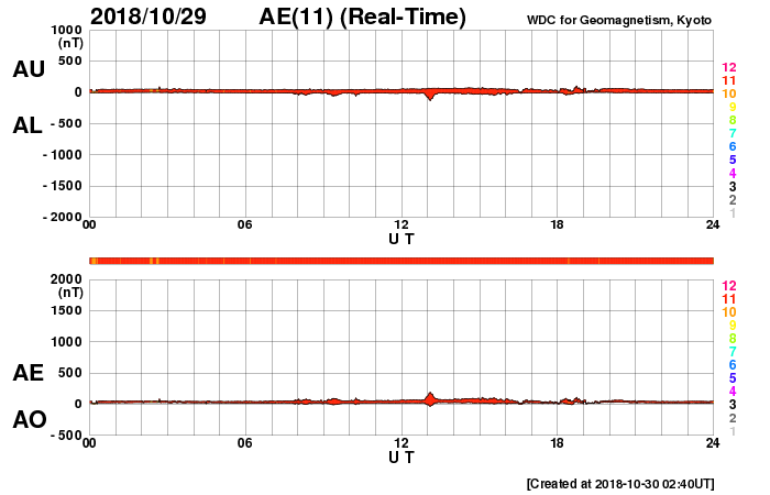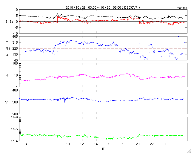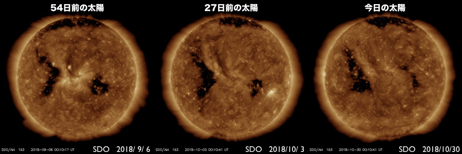 2018/10/30 11:59 更新 太陽風は320km/秒と低速の風が続いています。磁気圏も静穏です。 担当 篠原 太陽風の速度は、320km/秒に下がった状態で推移しています。 磁場強度も3nTとやや弱くなっています。 太陽風はとても穏やかです。 太陽風磁場の南北成分は、 0nT付近で小さく南北に変化しています。 速度が遅くなっていることもあり、磁気圏は穏やかで、 AE指数はほとんど変化していません。 SDO衛星AIA193では、 太陽の東側(左側)にコロナホールが三角形に広がっています。 この様子を、1周期前(27日前)、2周期前(54日前)と 比べてみます(1枚目の図)。 すると、広がりが北半球に偏るようになっていますが、 全体としては同じ様な見え方になっています。 このため、今後やって来る太陽風の高まりも、 前周期と同様の変化になりそうです。 27日周期の図では、 前周期は10月7日(世界時)に速度の高まりが始まっています。 このまま今回にあてはめると、 11月3日頃の到来になりそうです。 オーロラの活動も強まるでしょうか。 太陽は無黒点です。 穏やかな状態が続いています。