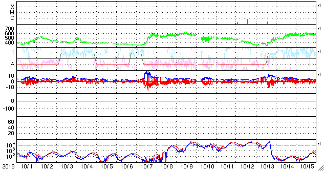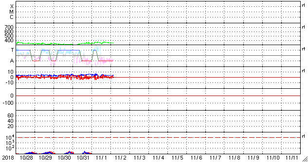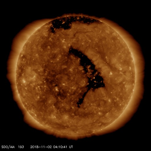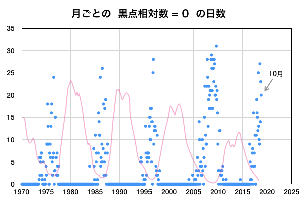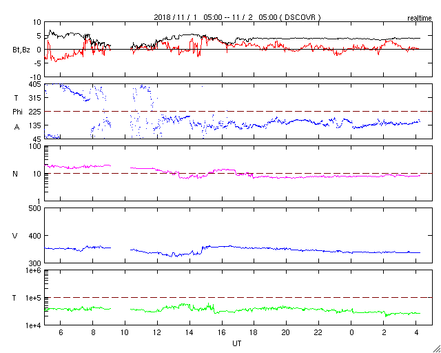 2018/11/ 2 13:26 更新 低速の太陽風が続いています。10月の黒点数は 4.9 でした。 担当 篠原 WDC-SILSOより、 10月の黒点相対数の月平均値は、 4.9 と発表されました。 9月の 3.3 とほぼ同じ値です。 また、無黒点の日数は20日に達していて、 こちらも、9月の23日とほぼ同じです。 1枚目の図では、黒点数を示す点は0の近くに留まり、 3枚目の図では、無黒点の日数は 月の半分を超えるのが当たり前になっています。 前の極小期の2008〜2009年頃は、 この傾向がさらに強まっていて、黒点数は1前後、 無黒点の日は25日を超えるくらいに達していました。 今期もここまで極端に下がるのでしょうか。 太陽風は、340km/秒と低速の風が続いています。 磁場強度は、3〜4nTとやや弱くなっています。 太陽風磁場の南北成分は、 0nT付近か、やや北寄りになっています。 現在、AE指数のデータを見ることができないのですが、 磁気圏も穏やかな状態が続いていると思われます。 SDO衛星AIA193では、 大きく広がるコロナホールは少し西に進み、 地球への影響の始まりが近付いています。 明日以降、変化の始まりに注目してください。 太陽は無黒点で穏やかです。