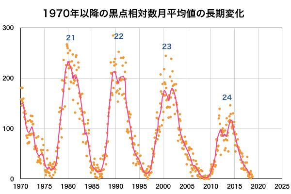 (c) 黒点データ:WDC-SILSO、作図:宇宙天気ニュース ![]() 1970年以降の太陽黒点相対数の長期変化。 (c) 黒点データ:WDC-SILSO、作図:宇宙天気ニュース ![]() 1970年以降の月毎の無黒点日の日数。 (c) 黒点データ:WDC-SILSO、作図:宇宙天気ニュース ![]() SDO衛星のAIA193カメラによる太陽コロナの様子 (c) SDO (NASA) ![]() SDO衛星による太陽の可視光写真 (c) SDO (NASA) ![]() DSCOVRが観測した太陽風の磁場(1番上の枠、黒線は全体の強度、赤線は南北成分) および、太陽風の密度(3番目の紫線)、速度(4番目の青線) (c) データ:NOAA/SWPC、作図:宇宙天気ニュース ![]() 27日の太陽周期に合わせたデータプロット 太陽が同じ面を地球に向けていた27日前の変化から、今後を予想することができます。 (c) 作図:宇宙天気ニュース