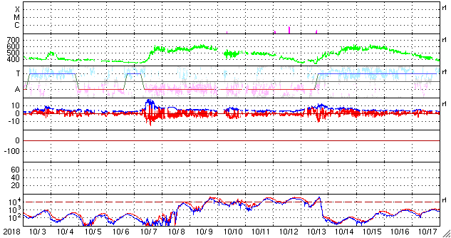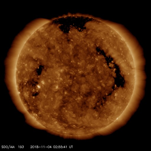 - 2018/11/ 2 13:26 低速の太陽風が続いています。10月の黒点数は 4.9 でした。