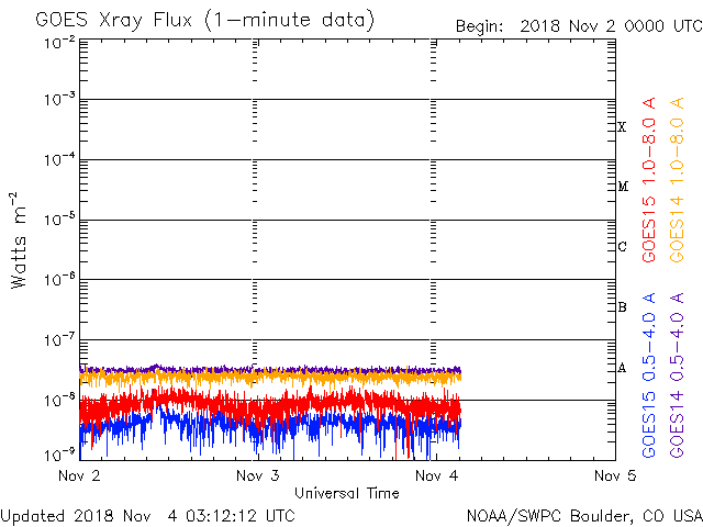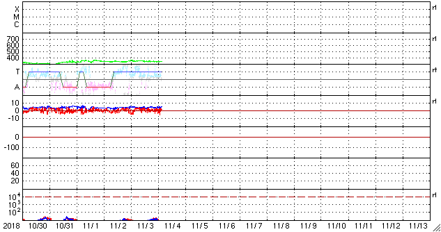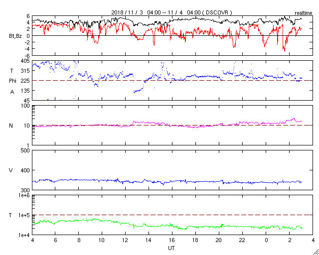- 2018/11/ 3 12:31 低速の太陽風が続いています。この後、コロナホールの影響が始まりそうです。
