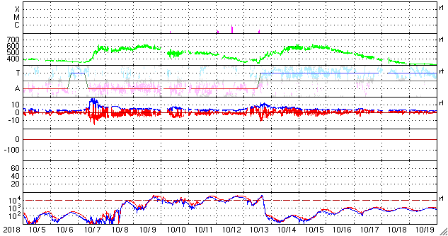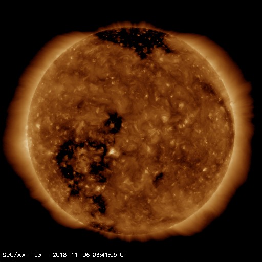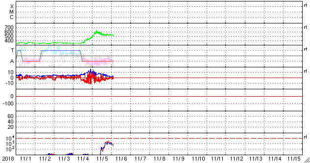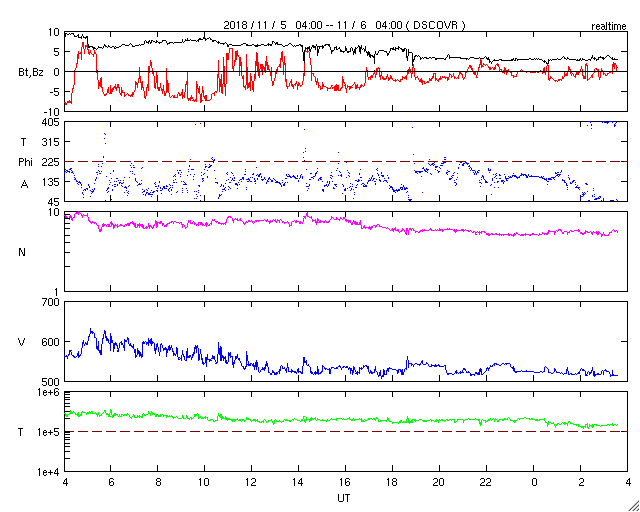 2018/11/ 6 12:48 更新 520km/秒の高速太陽風が続いています。 担当 篠原 太陽風の速度は、昨日の午後に600km/秒に達し、 その後は低下して、夜以降は520km/秒で推移しています。 高速の太陽風は続いています。 太陽風の磁場強度は、速度よりも少し早く15nTまで高まり、 以降はゆっくりと低下して、 現在は3nTとやや弱い程度になっています。 太陽風の高まりとしては、 ピークを過ぎて後半に入っているのかもしれません。 太陽風磁場の南北成分は、昨日のニュース以降も南寄りに推移して、 -5nT前後の南向きが続きました。 速度も高まっているため、磁気圏の活動は活発になりました。 昨日の午後には、アラスカのライブカメラで きれいなオーロラを見ることができました。 太陽風のグラフの後半では、 磁場の南北成分は0nT付近で変化する様になっています。 現在の磁気圏はやや落ち着いた状態になっている様です。 SDO衛星AIA193では、 今回の高速太陽風をもたらしたコロナホールは、 太陽の西の端(右端)に沈もうとしています。 一方、南東(左下)には、次のコロナホールが大きく広がっています。 4日後くらいからこの領域の影響が始まりそうです。 太陽は、無黒点の状態が続いています。 ![]() SDO衛星のAIA193カメラによる太陽コロナの様子 (c) SDO (NASA) ![]() SDO衛星による太陽の可視光写真 (c) SDO (NASA) ![]() DSCOVRが観測した太陽風の磁場(1番上の枠、黒線は全体の強度、赤線は南北成分) および、太陽風の密度(3番目の紫線)、速度(4番目の青線) (c) データ:NOAA/SWPC、作図:宇宙天気ニュース ![]() 27日の太陽周期に合わせたデータプロット 太陽が同じ面を地球に向けていた27日前の変化から、今後を予想することができます。 (c) 作図:宇宙天気ニュース