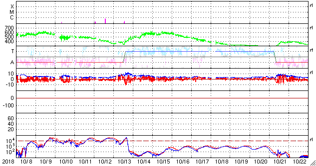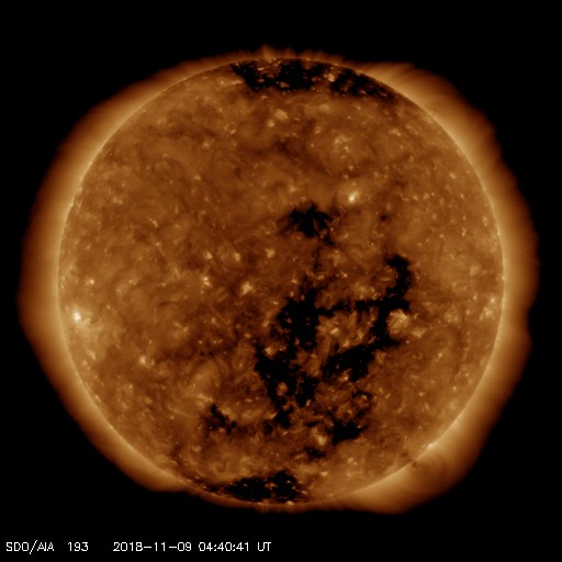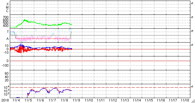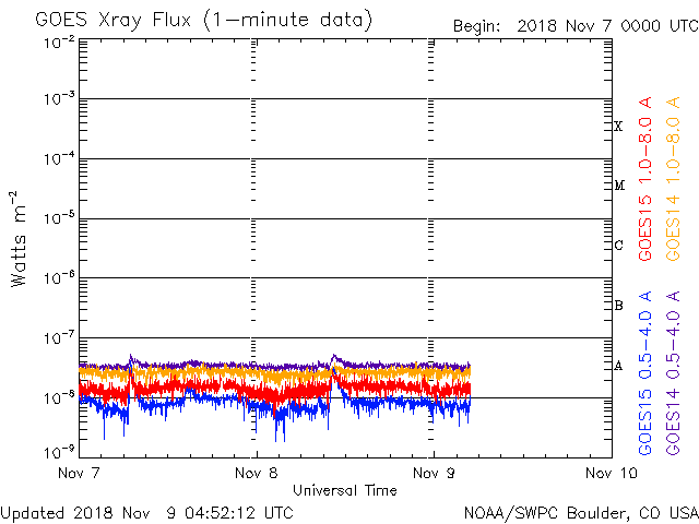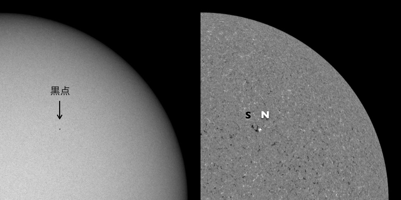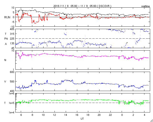 2018/11/ 9 13:56 更新 太陽の北半球に新しい活動周期の特徴を持つ黒点が出現しています。 担当 篠原 太陽の中央部の北半球に黒点が出現しています。 磁場の分布を見ると、左側にS極(黒)、右側にN極(白)と、 太陽の次の活動周期である、第25活動周期の順番になっています。 出現している緯度も25度程度と高めで、 新しい周期に属する黒点と言えるのかもしれません。 同様に第25期の磁場極性を持った黒点については、 国立天文台太陽観測科学プロジェクト三鷹太陽地上観測のページの、 4月の報告書において(リンクはバックナンバーのページ)、 4月10日に太陽の南半球に出現したことが報告されています。 (南半球なので、磁場の並びは逆になっています) 今回の黒点も同様の出現かもしれません。 昨日の出現以降の様子を、可視光と磁場写真の動画で紹介します。 11年に1度の太陽活動の切り替わりです。 変化はゆっくり進みますが、今後の推移に注目してください。 X線グラフに変化はなく、太陽は全体としては穏やかです。 太陽風は、昨日の夜にかけて500km/秒まで速度が高まり、 その後、少し低下していますが、450km/秒とやや高速の状態です。 SDO衛星AIA193の太陽写真で注目していた 南半球のコロナホールの影響としては、まだ早い様に見えます。 27日周期の図で前周期の10月10〜11日頃に見られていた 太陽風速度の高まりが、 このタイミングでやって来たのかもしれません。 太陽風の磁場強度は、6nTから3nTに下がっています。 南北成分は、グラフの前半に南向きにやや大きく変化していますが、 その後は、0nT付近で小さく変化する程度です。 磁気圏の活動は、初めの変化でやや高まり、 以降は穏やかになっている様です。 明日くらいから、コロナホールの影響がやって来ると思います。 オーロラの活動は高まるでしょうか。