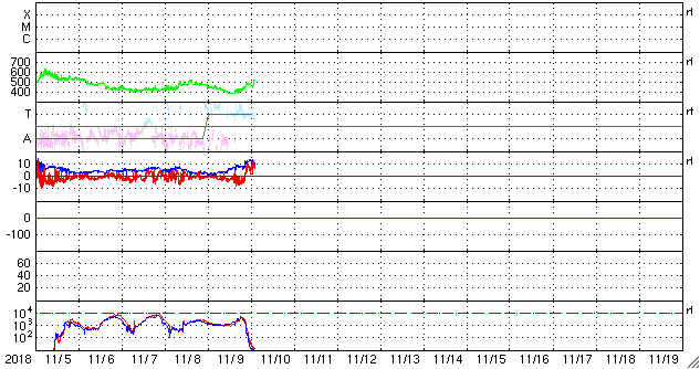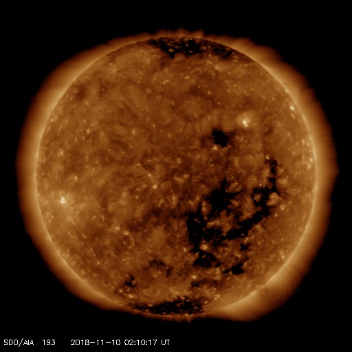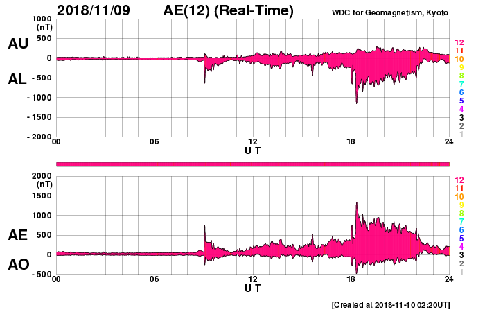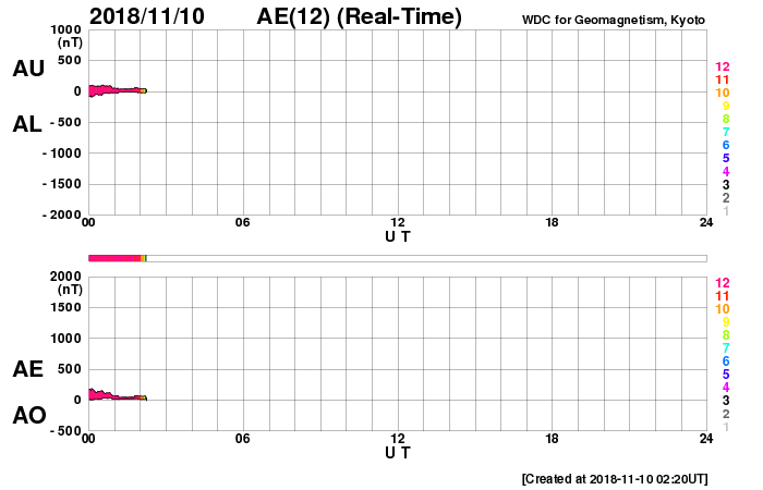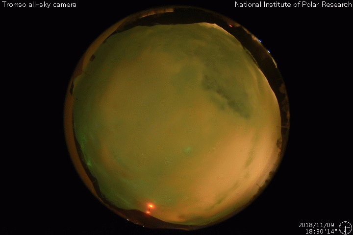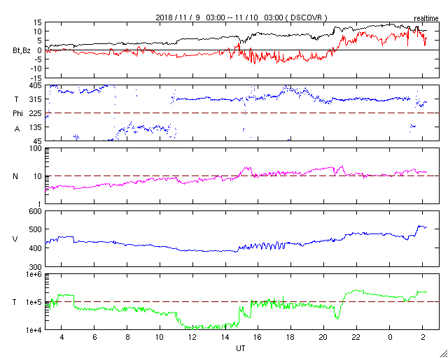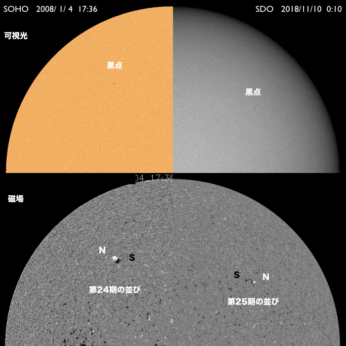 2018/11/10 11:27 更新 第25期の性質を持つ黒点は今日も見えています。コロナホールの影響が始まりました。 担当 篠原 太陽の北半球に現れた、 太陽の次の活動周期である第25期の性質を持った黒点は、 小さくなっていますが、現在も見えています。 今から11年前の2008年1月4日に、 現在の第24活動周期の最初の黒点が太陽の北半球に現れました(記事)。 今回の黒点も北半球なので、2つの写真を並べて比較してみます。 1枚目の写真の左側は、SOHO衛星による2008年1月4日の太陽。 右側は、SDO衛星による今日、2018年11月10日の太陽です。 上段は可視光、下段は磁場分布の写真です。 左の2008年の写真の黒点の場所の磁場分布を見ると、 左にN極(白)、右にS極(黒)となっています。 これは、現在の第24活動周期の順番です (当時は、この日に新しく現れた特徴でした)。 一方、右の今日の写真では、黒点は小さくなって見にくくなっていますが、 磁場の順番は、左にS極(黒)、右にN極(白)と入れ替わっています。 黒点の磁場の並びは、太陽の活動周期毎に入れ替わります。 今回の黒点は次の第25期の性質を持っているのです。 この黒点は小さすぎるのか、 今日のNOAAの太陽黒点リストには番号が掲載されていませんでした。 その他に黒点はありません。 X線グラフも穏やかです。 太陽風は、昨夜から磁場強度が強まり始め、 今朝、13nTまで高まりました。 現在は少し下がっていますが、10nTと強まった状態が続いています。 コロナホールの影響が始まった様ですが、 速度の変化はゆっくりと480km/秒に高まり、 グラフの最後でやっと500km/秒と高速の状態に達したところです。 27日周期の図を見ると、 前周期も1日ほどかけて600km/秒近くまで高まっています。 この後も、更に速度は高まっていくでしょう。 太陽風磁場の南北成分は、 グラフの中盤で南向きに-5nT程度の変化が続いています。 このため、磁気圏の活動は高まって、 AE指数は(今日は回復しています)、300nT程度の変化で始まり、 やがて、500〜1000nTの大きな活動に高まっています。 最大の変化が起きた頃、世界時11月9日19時頃のオーロラの様子を、 ノルウェー・トロムソの全天カメラの動画で紹介します。 曇り空ですが、その上でオーロラの強い光が輝いています。 その後、磁場は北向きに切り替わり、現在は北に強まっています。 このため、磁気圏の活動は静かになってしまいました。 SDO衛星AIA193では、南半球のコロナホールは、 最後の領域が太陽の中心線を通過したところです。 これから、4〜5日くらい高速の太陽風が続くかもしれません。 磁場が再び南向きに切り替われば、オーロラの活動も再び高まるでしょう。 ![]() 2008年の第24期最初の黒点と、今回の第25期の特徴を持つ黒点。SOHO衛星、SDO衛星の可視光、磁場写真より。 (c) SDO (NASA)、SOHO (ESA & NASA)、作図:宇宙天気ニュース ![]() ノルウェーのトロムソで全天カメラにより撮影された、世界時10日19時頃のオーロラ。 (c) 国立極地研究所、(動画加工 : 宇宙天気ニュース) ![]() SDO衛星のAIA193カメラによる太陽コロナの様子 (c) SDO (NASA) ![]() SDO衛星による太陽の可視光写真。マウスの矢印を写真に重ねると、黒点番号付きの写真に切り替わります。 (c) SDO (NASA) ![]() GOES衛星の太陽X線データ (c) NOAA/SWPC ![]() DSCOVRが観測した太陽風の磁場(1番上の枠、黒線は全体の強度、赤線は南北成分) および、太陽風の密度(3番目の紫線)、速度(4番目の青線) (c) データ:NOAA/SWPC、作図:宇宙天気ニュース ![]() AE指数(速報値) 下段のAEグラフの値が高くなると、オーロラ活動が活発化しています。 (c) 京都大学WDC ![]() ![]() 27日の太陽周期に合わせたデータプロット 太陽が同じ面を地球に向けていた27日前の変化から、今後を予想することができます。 (c) 作図:宇宙天気ニュース