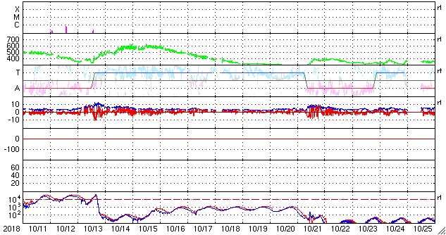 (c) SDO (NASA)、作図:宇宙天気ニュース ![]() SDO衛星のAIA193カメラによる太陽コロナの様子 (c) SDO (NASA) ![]() SDO衛星による太陽の可視光写真。マウスの矢印を写真に重ねると、黒点番号付きの写真に切り替わります。 (c) SDO (NASA) ![]() GOES衛星の太陽X線データ (c) NOAA/SWPC ![]() DSCOVRが観測した太陽風の磁場(1番上の枠、黒線は全体の強度、赤線は南北成分) および、太陽風の密度(3番目の紫線)、速度(4番目の青線) (c) データ:NOAA/SWPC、作図:宇宙天気ニュース ![]() AE指数(速報値) 下段のAEグラフの値が高くなると、オーロラ活動が活発化しています。 (c) 京都大学WDC ![]() ![]() 27日の太陽周期に合わせたデータプロット 太陽が同じ面を地球に向けていた27日前の変化から、今後を予想することができます。 (c) 作図:宇宙天気ニュース