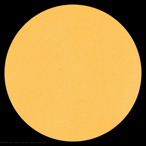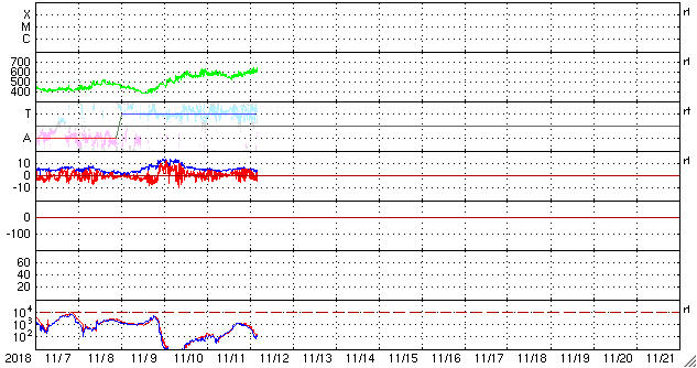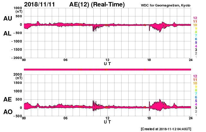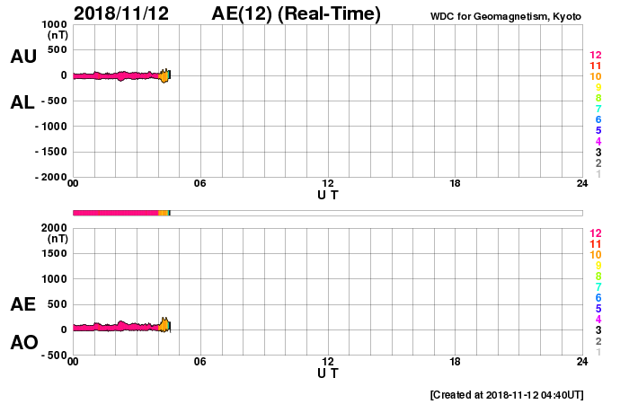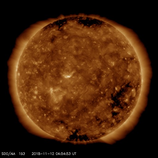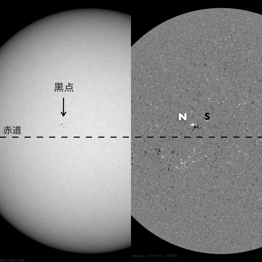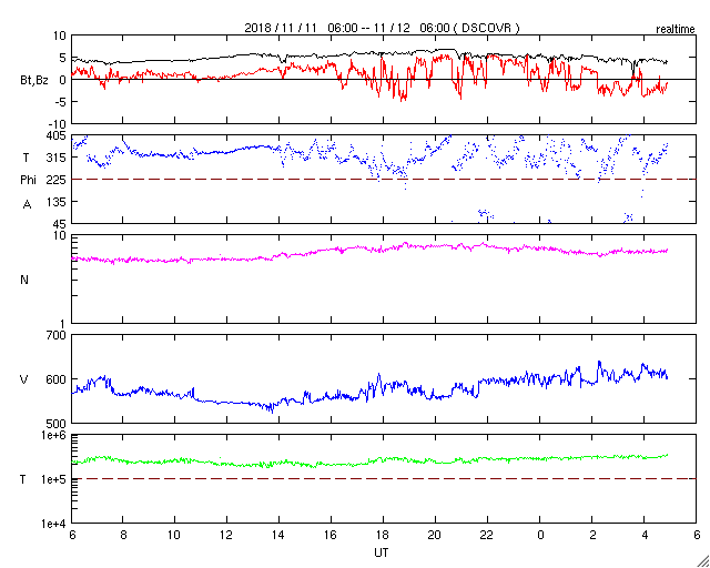 2018/11/12 14:04 更新 太陽風は高速の状態が続いています。太陽の中央部に黒点が現れました。 担当 篠原 昨夜遅く、太陽の中央部に黒点が現れ、 現在の可視光写真でも見えています。 今朝のNOAAの報告書では、まだ番号は付けられていませんでした。 この黒点は、北緯5度程度と北半球の低い緯度に発生しています。 磁場の並びは、左にN極(白)、右にS極(黒)となっていて、 現在の第24活動周期の北半球の黒点の並び方です。 9日に現れた黒点は、次の第25期の特徴を持っていましたが、 活動周期が切り替わっていくこれからの期間は、 両方の活動周期の特徴を持った黒点が見られるでしょう。 太陽に特に活動はなく、穏やかです。 太陽風は、昨夜にかけて550km/秒へ速度を下げましたが、 今日に入るとまた高まり、600km/秒に戻っています。 磁場強度は、4〜6nTをゆっくりと変化していますが、 平均的な状態です。 磁場の南北成分は、北寄りになっている時間が多く、 時々、南向きに振れています。 この様な時間帯に、AE指数で300〜500nTの 小規模の活動が発生しています。 高速太陽風は続いていますが、磁場の振れ方の影響で、 磁気圏の活動はそれほど強まっていません。 SDO衛星AIA193では、 コロナホールは太陽の西の端へ進んでいます。 太陽風の高まりは、後半へ入っていきそうです。