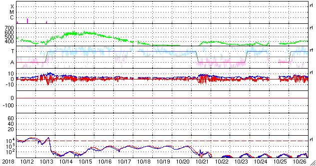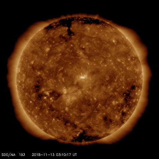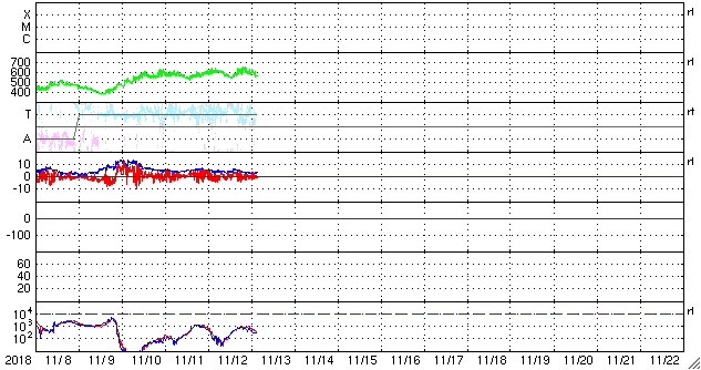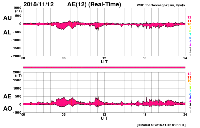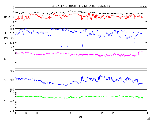 2018/11/13 12:23 更新 高速太陽風は続いています。磁気圏は小規模の活動程度です。 担当 篠原 太陽風の速度は、 600km/秒と550km/秒の間をゆっくりと上下しています。 現在は、550km/秒に下がったところです。 一方、磁場強度は5nTから3nTに下がっています。 高速太陽風の領域は後半に入っていて、 速度は次第に低下に向かいそうです。 太陽風磁場の南北成分は、 0nT付近で小さく変化するか、北寄りで推移しています。 速度は高まっていますが、磁気圏の活動は小規模の変化に留まっていて、 AE指数は、変化は頻繁に起きていますが、300〜500nT程度です。 SDO衛星AIA193では、 コロナホールは西の端に近付いて、見つけにくくなってきました。 27日周期の図では、前周期は10月16日以降、速度が下がっています。 今回もこれから同様の変化をするのではないでしょうか。 太陽は、昨日現れた中央部の黒点に、 2726群と番号が付けられています。 規模は小さくなっていて、掲載の写真では、微かに見える程度です。