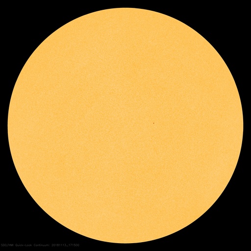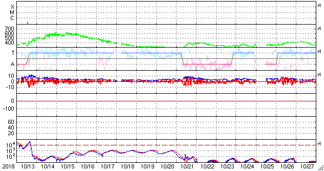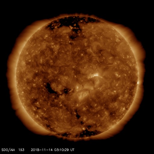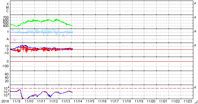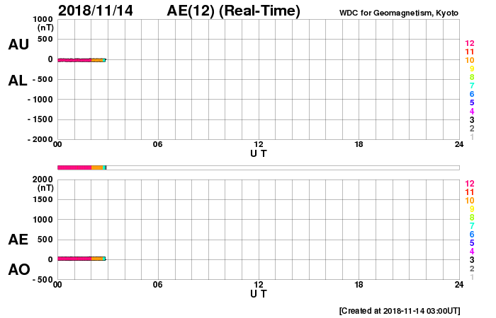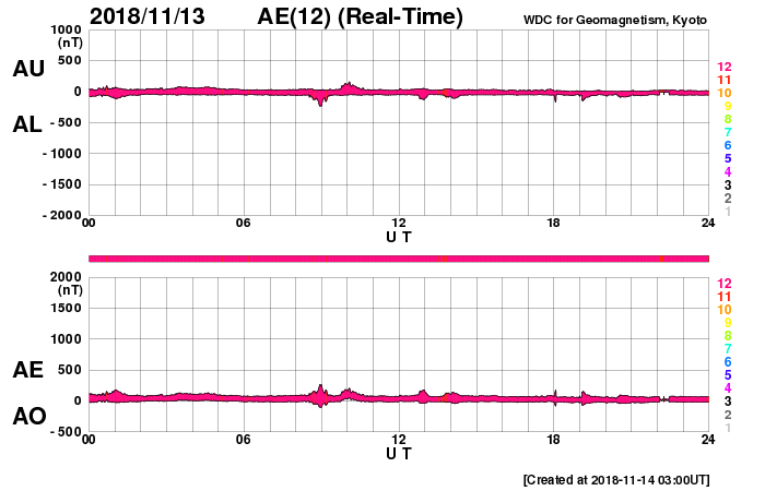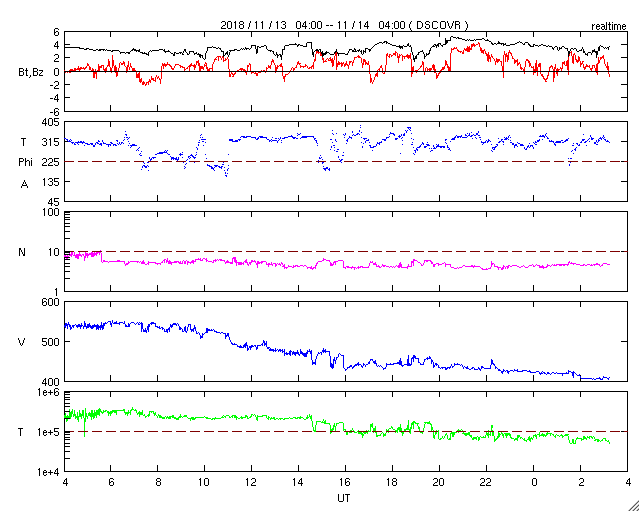 2018/11/14 12:24 更新 太陽風の速度は下がり、平均的な速さに戻っています。磁気圏は穏やかです。 担当 篠原 太陽風の速度は、昨日の夕方までは550km/秒を保っていましたが、 夜になると下がり始め、今日の未明に450km/秒とやや高速になり、 現在は400km/秒と平均的な速さまで下がっています。 高速の太陽風は、およそ4日で終わりました。 太陽風の磁場強度は、3nT前後とやや弱い状態で推移しています。 南北成分は、全体としては北寄りです。 速度の低下もあり、磁気圏は穏やかになっていて、 AE指数に目立った変化は発生していません。 SDO衛星AIA193では、 コロナホールの目立った広がりは見られません。 この後、太陽風は穏やかに推移しそうです。 太陽は、2726黒点群の黒点が昨日よりもはっきり見えています。 特に活動はなく、穏やかです。