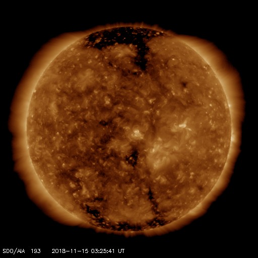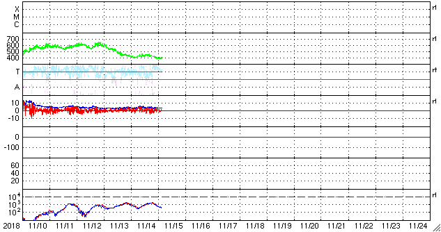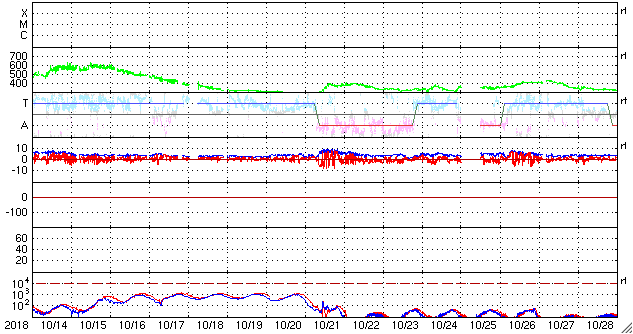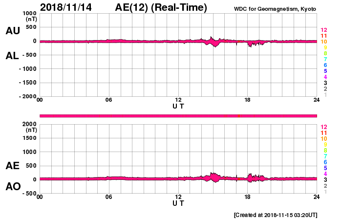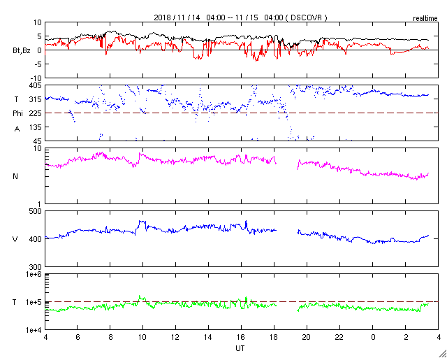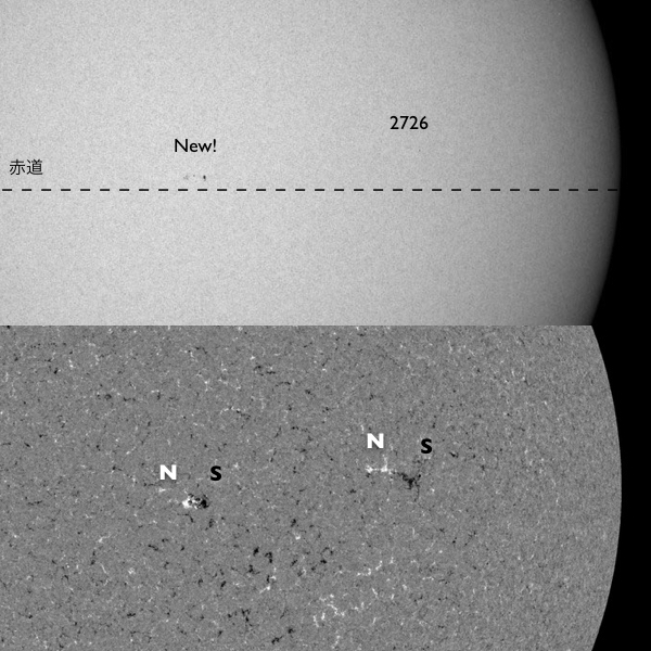 2018/11/15 12:40 更新 太陽の中央に新しい黒点が現れました。太陽風は平均的な状態です。 担当 篠原 今日の未明に、太陽の中心部に新しい黒点が発生しています。 赤道に近く、磁場の並びは、となりの2726黒点群と同様、 現在の第24活動周期の順番です。 まだ番号は付いていませんが、 いつもの可視光写真でもはっきりと見えています。 新しい活動周期の黒点は、 緯度は30度程度と赤道から少し離れた場所に現れます。 次はいつ出現するでしょうか。 2726黒点群は、かなり見にくくなっています。 太陽風は、400km/秒と平均的な速さです。 磁場強度も、4nTと平均的です。 磁場の南北成分は、北寄りの傾向が続いていて、 時々小さく南に振れる程度です。 磁気圏は穏やかで、AE指数はほとんど変化が見られません。 SDO衛星AIA193では、 極域や高緯度域にコロナホールは見えていますが、 赤道、低緯度域に濃い広がりはありません。 太陽風は穏やかな状態が続きそうです。 ![]() 太陽の中心部に現れた黒点は、第24活動周期の磁場の並びになっています。SDO衛星。 (c) SDO (NASA)、作図:宇宙天気ニュース ![]() SDO衛星のAIA193カメラによる太陽コロナの様子 (c) SDO (NASA) ![]() SDO衛星による太陽の可視光写真。マウスの矢印を写真に重ねると、黒点番号付きの写真に切り替わります。 (c) SDO (NASA) ![]() GOES衛星の太陽X線データ (c) NOAA/SWPC ![]() DSCOVRが観測した太陽風の磁場(1番上の枠、黒線は全体の強度、赤線は南北成分) および、太陽風の密度(3番目の紫線)、速度(4番目の青線) (c) データ:NOAA/SWPC、作図:宇宙天気ニュース ![]() AE指数(速報値) 下段のAEグラフの値が高くなると、オーロラ活動が活発化しています。 (c) 京都大学WDC ![]() ![]() 27日の太陽周期に合わせたデータプロット 太陽が同じ面を地球に向けていた27日前の変化から、今後を予想することができます。 (c) 作図:宇宙天気ニュース