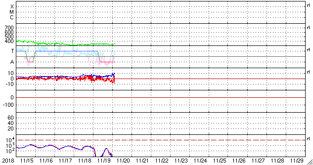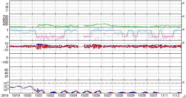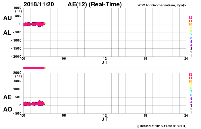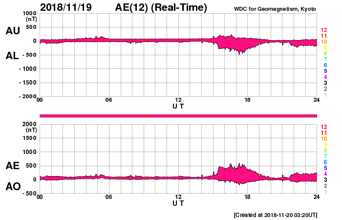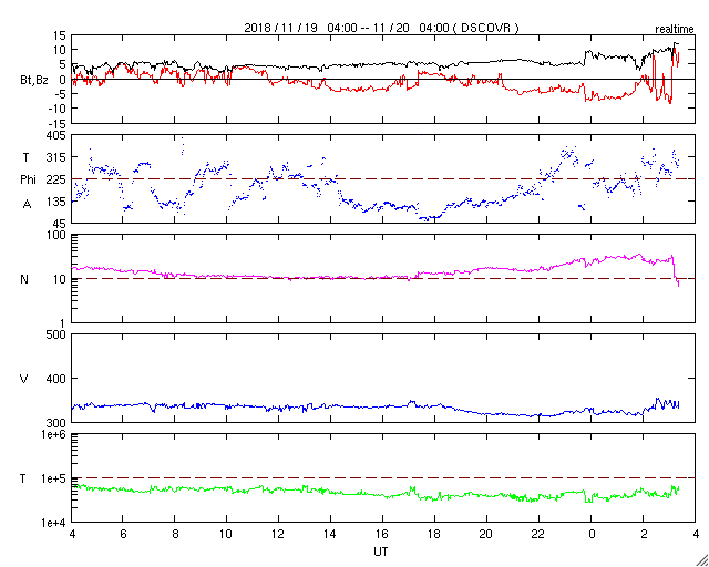 2018/11/20 12:39 更新 太陽風は低速ですが、磁場が強まっています。ムルマンスクのオーロラをどうぞ。 担当 篠原 ロシア・ムルマンスクの福島留美さんより、 9〜11月にかけてムルマンスク州で撮影された オーロラの写真をいただきました。 今日は前半の4枚を紹介します。 現地では、この時期に多くのオーロラ写真が撮影されていたそうで、 9月だけでも120作品の中から選んでいただいたとのことです。 (リンク先で更に多くの作品を見ることができます) 1枚目は、太陽風が高まる前の夜に撮影されていますが、 その他は、高速風の到来でオーロラの活動が高まった頃の撮影です。 3枚目のオーロラは、見事に数字の「2」の形になっています。 もちろんフォトショップなどの細工は行われておらず、 撮影者のA・ステパーネンコ氏から作品名として、 「評価4は堅いって言われてたのに、評価2なんて貰っちゃったョ!」 との冗談が付けられていたそうです。 天の採点も厳しいですね(鹿児島高専はもうすぐ中間試験です)。 その他の3枚は、水面に映るオーロラの色合いも見事です。 この頃は、地上の景色がまだ秋ですね。 美しい写真や不思議な写真をありがとうございます。 現在の太陽風は、速度は330km/秒と低速で安定していますが、 磁場強度が5nTから10nTに強まっています。 27日周期の図を見ると、セクターの切り替わりが発生していて、 弱い太陽風の乱れをもたらしている様です。 磁場の南北成分は南寄りに変わっていて、 AE指数では、グラフの後半から 300〜500nTの小規模の活動が発生しています。 この後、速度の高まりが見られるでしょうか。 引き続き、太陽風の変化に注目してください。 太陽の2727黒点群は、西の端に近付くとともに、 大きさは小さくなっていて、 掲載の写真ではほとんど分からなくなっています。 太陽は、このまま無黒点になりそうです。 ![]() 9月9日に、ロシア・ムルマンスク州で撮影されたオーロラ。 (c) 福島留美氏、L・トリフォノワ氏 ![]() 9月14日に、ロシア・ムルマンスク州キーロフスク市で撮影されたオーロラ。 (c) 福島留美氏、V・ジガーノフ氏 ![]() 10月1日に、ロシア・ムルマンスク州で撮影されたオーロラ。 (c) 福島留美氏、A・ステパーネンコ氏 ![]() 10月7日に、ロシア・ムルマンスク州で撮影されたオーロラ。 (c) 福島留美氏、A・シェミャキン氏 ![]() SDO衛星のAIA193カメラによる太陽コロナの様子 (c) SDO (NASA) ![]() SDO衛星による太陽の可視光写真。マウスの矢印を写真に重ねると、黒点番号付きの写真に切り替わります。 (c) SDO (NASA) ![]() DSCOVRが観測した太陽風の磁場(1番上の枠、黒線は全体の強度、赤線は南北成分) および、太陽風の密度(3番目の紫線)、速度(4番目の青線) (c) データ:NOAA/SWPC、作図:宇宙天気ニュース ![]() AE指数(速報値) 下段のAEグラフの値が高くなると、オーロラ活動が活発化しています。 (c) 京都大学WDC ![]() ![]() 27日の太陽周期に合わせたデータプロット 太陽が同じ面を地球に向けていた27日前の変化から、今後を予想することができます。 (c) 作図:宇宙天気ニュース