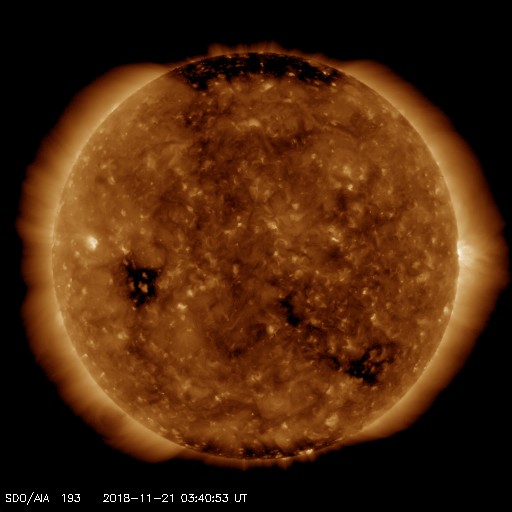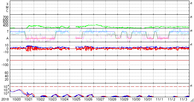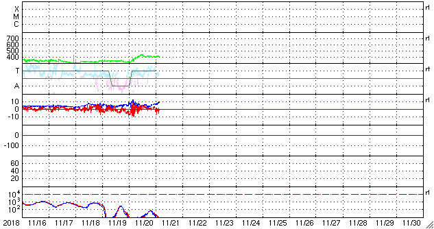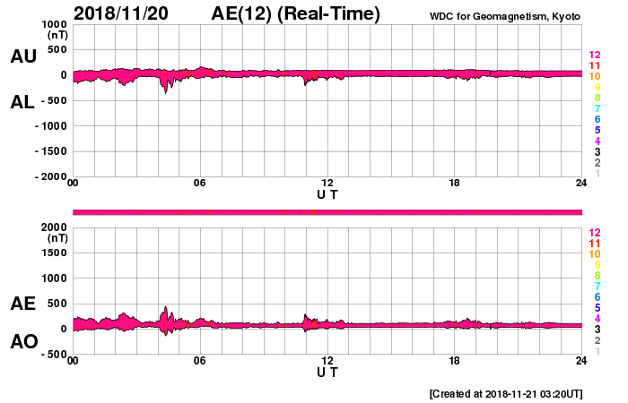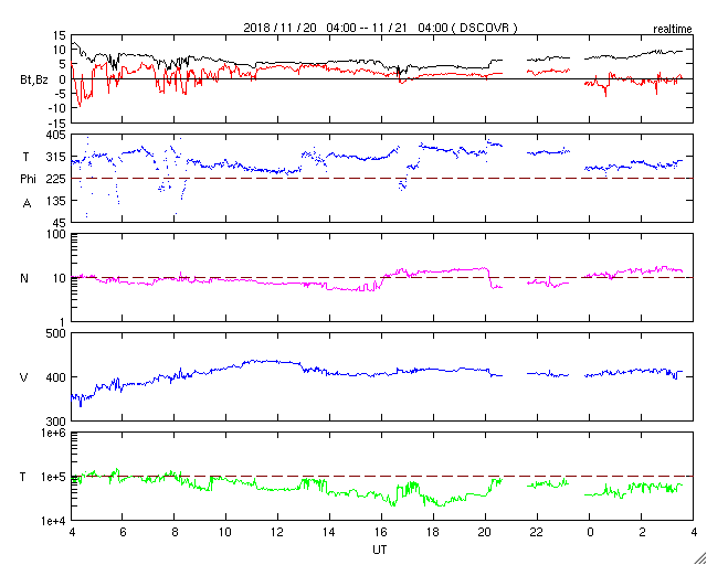 2018/11/21 12:49 更新 太陽風は平均的な速度に上がっています。ムルマンスクのオーロラをどうぞ。 担当 篠原 昨日に続き、福島留美さんより送っていただいた、 9〜11月のロシア・ムルマンスク州のオーロラの写真を紹介します。 1枚目は、高速太陽風が始まった日。 2枚目は、その高速風が最高速度を迎えた頃の撮影です。 撮影時刻は分かりませんが、 この2枚の頃のAE指数は、1000nTに達する変化を繰り返していました。 3枚目も高速風の中での撮影ですが、 AE指数の変化は500nT程度で、前の2枚よりは弱い頃です。 しかし、撮影されているオーロラは見事で、 指数だけでは上空の様子は分からないと実感します。 4枚目は、太陽風は穏やかになっていて、 写真のオーロラの光も控えめです。 この写真には、不思議な光跡が写っています。 撮影者も正体は分からない様です。 地上の雪が、次第に目立つ様になっているのが印象的です。 計8枚の美しい写真を、 選考も含めてどうもありがとうございました。 太陽風の速度は、400km/秒と平均的な状態に上がっています。 昨日の磁場の強まりと関連した変化の様です。 その磁場強度は、10nTから5nTに下がり、 再び10nTに高まる変化をしています。 磁場の南北成分は、0nT付近で小さく変化する程度です。 磁気圏は穏やかで、AE指数は特に変化は起きていません。 SDO衛星AIA193の太陽の南半球に見えていたコロナホールは、 西側(右側)に半分ほど進んでいます。 この後、速度に更に変化が起きるでしょうか。 また、太陽の東側(左側)にも小さいコロナホールが見えています。 広がりがないので、影響は小さく留まりそうです。 太陽は、2727黒点群が西に沈み、無黒点になっています。 X線グラフも変化はありません。 ![]() 10月7日に、ロシア・ムルマンスク州で撮影されたオーロラ。 (c) 福島留美氏、I・オルロフ氏 ![]() 10月9日に、ロシア・ムルマンスク州で撮影されたオーロラ。 (c) 福島留美氏、M・レトヴァルツェフ氏 ![]() 11月11日に、ロシア・ムルマンスク州で撮影されたオーロラ。 (c) 福島留美氏、O・クジコワ女史 ![]() 11月16日に、ロシア・ムルマンスク州で撮影されたオーロラ。 (c) 福島留美氏、A・ステパーネンコ氏 ![]() SDO衛星のAIA193カメラによる太陽コロナの様子 (c) SDO (NASA) ![]() SDO衛星による太陽の可視光写真 (c) SDO (NASA) ![]() DSCOVRが観測した太陽風の磁場(1番上の枠、黒線は全体の強度、赤線は南北成分) および、太陽風の密度(3番目の紫線)、速度(4番目の青線) (c) データ:NOAA/SWPC、作図:宇宙天気ニュース ![]() AE指数(速報値) 下段のAEグラフの値が高くなると、オーロラ活動が活発化しています。 (c) 京都大学WDC ![]() ![]() 27日の太陽周期に合わせたデータプロット 太陽が同じ面を地球に向けていた27日前の変化から、今後を予想することができます。 (c) 作図:宇宙天気ニュース