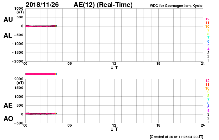 下段のAEグラフの値が高くなると、オーロラ活動が活発化しています。