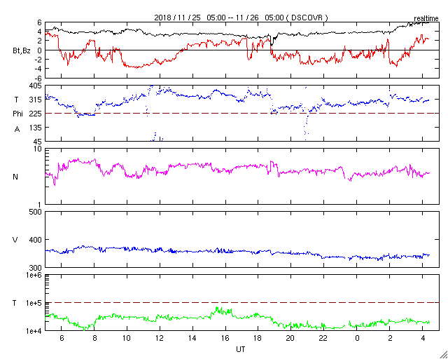 2018/11/22 13:03 太陽風は平均的な状態です。磁気圏も穏やかです。