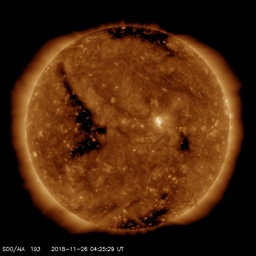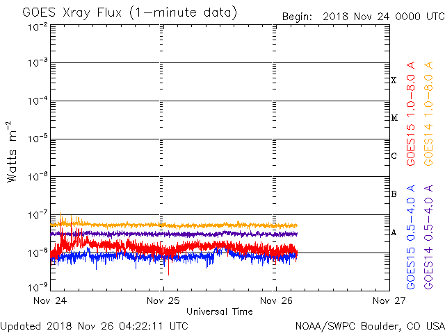 2018/11/25 14:01 太陽の中央に2728黒点群が見えています。太陽風は低速です。