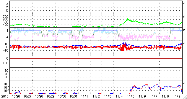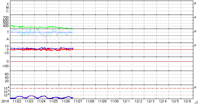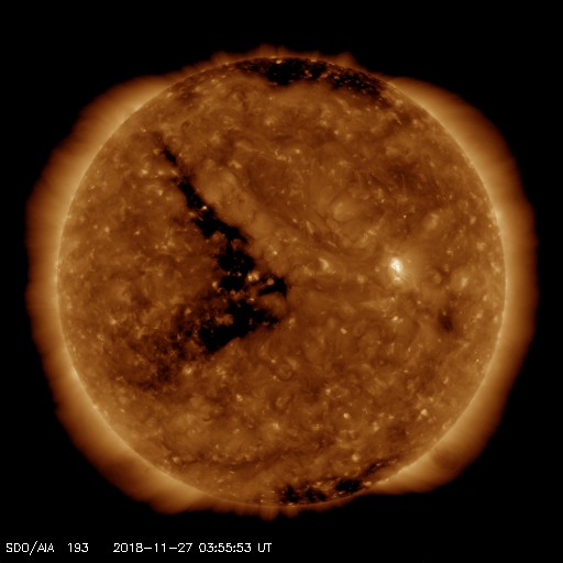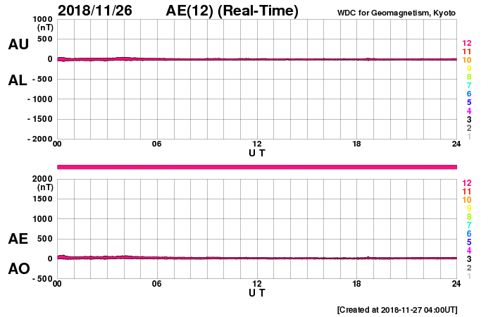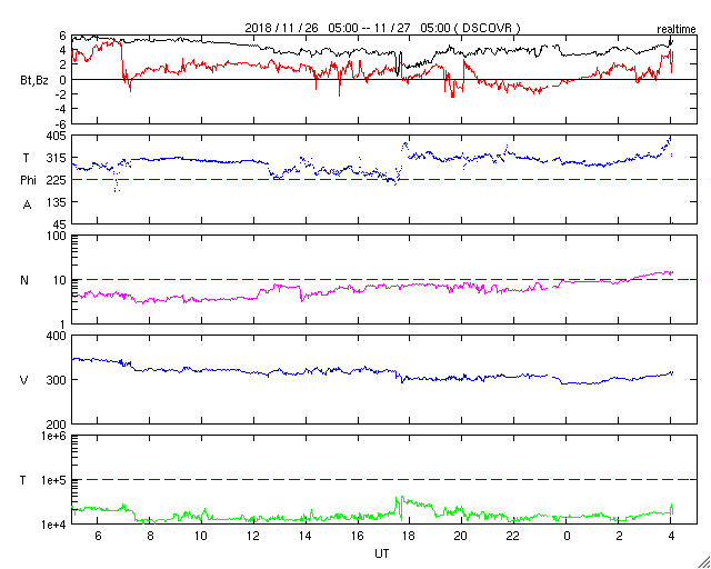 2018/11/27 13:11 更新 太陽風は更に低速になり、磁気圏も静かです。 担当 篠原 太陽風の速度は300km/秒に下がり、更に低速になっています。 磁場強度も、3〜4nTとやや弱くなっています。 磁場の南北成分は弱い北寄りです。 速度も下がっているので、磁気圏はとても穏やかで、 AE指数は変化が全く見られません。 SDO衛星AIA193では、 広いコロナホールの先頭(右端)が、太陽の中心線に達しています。 3〜4日後くらいから、太陽風の高まりが始まりそうです。 27日周期の図では、前周期は11月4日から 太陽風の磁場強度の増加、速度の高まりが発生しています。 そのまま下のグラフに対応させると、 12月1日頃の到来になりますが、どうなるでしょうか。 太陽は、無黒点で穏やかです。 SDO衛星AIA193の太陽コロナ写真では、 2728黒点群のあった場所が明るく光っています。