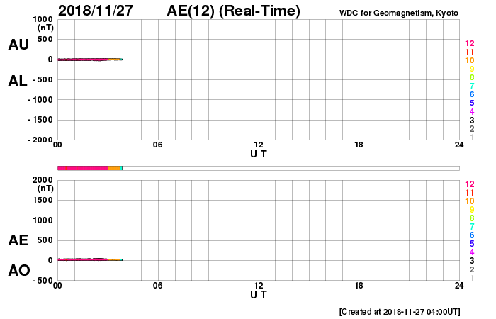 (c) SDO (NASA) ![]() SDO衛星による太陽の可視光写真 (c) SDO (NASA) ![]() DSCOVRが観測した太陽風の磁場(1番上の枠、黒線は全体の強度、赤線は南北成分) および、太陽風の密度(3番目の紫線)、速度(4番目の青線) (c) データ:NOAA/SWPC、作図:宇宙天気ニュース ![]() AE指数(速報値) 下段のAEグラフの値が高くなると、オーロラ活動が活発化しています。 (c) 京都大学WDC ![]() ![]() 27日の太陽周期に合わせたデータプロット 太陽が同じ面を地球に向けていた27日前の変化から、今後を予想することができます。 (c) 作図:宇宙天気ニュース