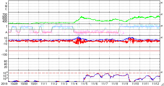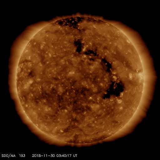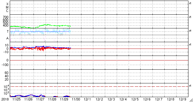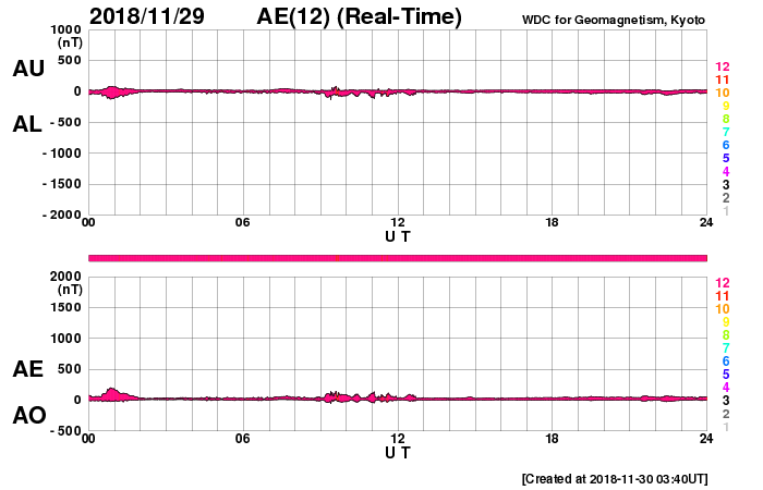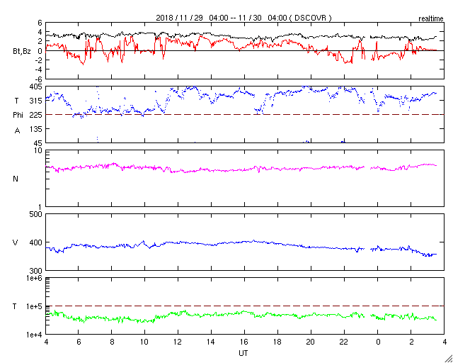 2018/11/30 12:49 更新 太陽風は低速で、磁気圏は穏やかです。コロナホールの影響が近付いています。 担当 篠原 太陽風の速度は、 昨夜にかけて380km/秒から400km/秒に上がり、 今日に入ると次第に下がって、現在は360km/秒の低速風です。 磁場強度も、3nTから2nTへ下がって弱まっています。 磁場の南北成分は、南北に小さく変化する程度で、 磁気圏は穏やかな状態が続いています。 SDO衛星AIA193では、 コロナホールの右端が西半球の半分くらいに進み、 影響が地球に到来する目安の位置に達しています。 一方、27日周期の図を見ると、 前周期の太陽風の高まりは、もう1日ほど経って始まっています 今回はどこから変化が始まるでしょうか。 今後の太陽風の推移に注目してください。 太陽は無黒点で、穏やかに推移しています。 ![]() SDO衛星のAIA193カメラによる太陽コロナの様子 (c) SDO (NASA) ![]() SDO衛星による太陽の可視光写真 (c) SDO (NASA) ![]() DSCOVRが観測した太陽風の磁場(1番上の枠、黒線は全体の強度、赤線は南北成分) および、太陽風の密度(3番目の紫線)、速度(4番目の青線) (c) データ:NOAA/SWPC、作図:宇宙天気ニュース ![]() AE指数(速報値) 下段のAEグラフの値が高くなると、オーロラ活動が活発化しています。 (c) 京都大学WDC ![]() ![]() 27日の太陽周期に合わせたデータプロット 太陽が同じ面を地球に向けていた27日前の変化から、今後を予想することができます。 (c) 作図:宇宙天気ニュース
