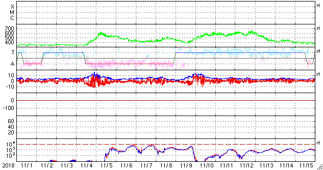 (c) 国立極地研究所、(動画加工 : 宇宙天気ニュース) ![]() SDO衛星のAIA193カメラによる太陽コロナの様子 (c) SDO (NASA) ![]() SDO衛星による太陽の可視光写真 (c) SDO (NASA) ![]() DSCOVRが観測した太陽風の磁場(1番上の枠、黒線は全体の強度、赤線は南北成分) および、太陽風の密度(3番目の紫線)、速度(4番目の青線) (c) データ:NOAA/SWPC、作図:宇宙天気ニュース ![]() AE指数(速報値) 下段のAEグラフの値が高くなると、オーロラ活動が活発化しています。 (c) 京都大学WDC ![]() ![]() 27日の太陽周期に合わせたデータプロット 太陽が同じ面を地球に向けていた27日前の変化から、今後を予想することができます。 (c) 作図:宇宙天気ニュース