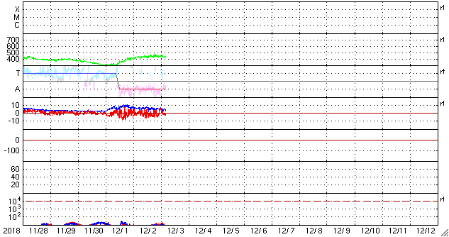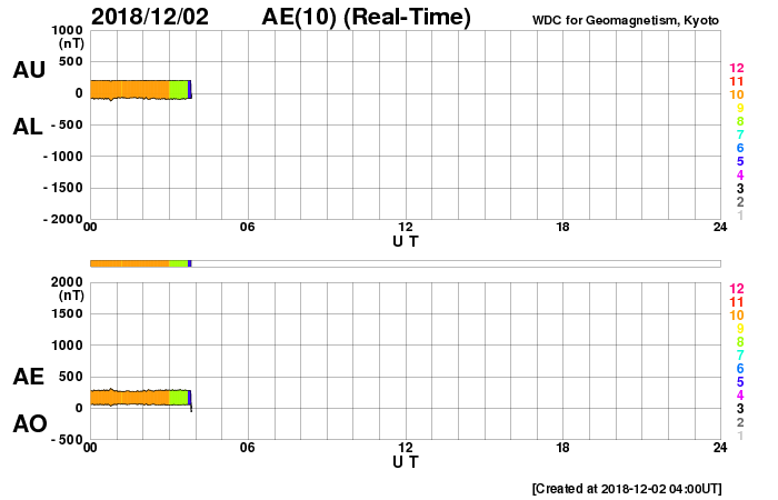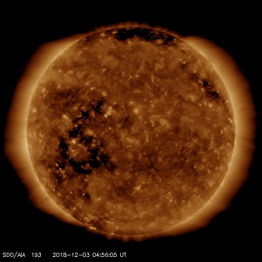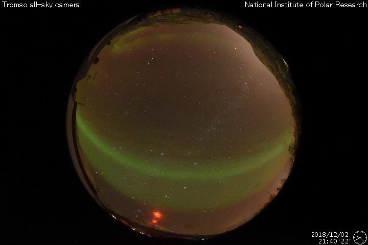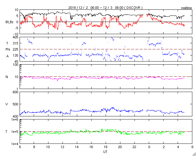 2018/12/ 3 14:10 更新 太陽風速度の高まりは、450km/秒とやや高速程度です。 担当 篠原 太陽風の速度は、 450km/秒へ少し上がった程度で落ち着いています。 今回の太陽風の高まりは、この程度に留まりそうです。 太陽風の磁場強度は、5nTと平均的な状態です。 南北成分は、南寄りになっていて、 -3nT前後の南向きが長い時間発生しています。 速度の高まりは小さいですが、 磁気圏の活動はある程度高まっていると思われます。 ノルウェー・トロムソの全天カメラでは、 活発なオーロラの活動が撮影されています。 SDO衛星AIA193では、 今回の太陽風の高まりをもたらしたコロナホールは、 太陽の西に進み、ほとんど見えなくなっています。 太陽風の速度は、この後下がっていくかもしれません。 一方、東からは次のコロナホールが太陽の中心線に近付いています。 こちらの影響は、4〜5日後くらいになりそうです。 太陽は無黒点です。 穏やかに推移しています。