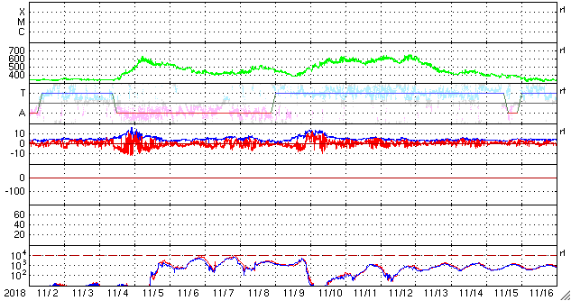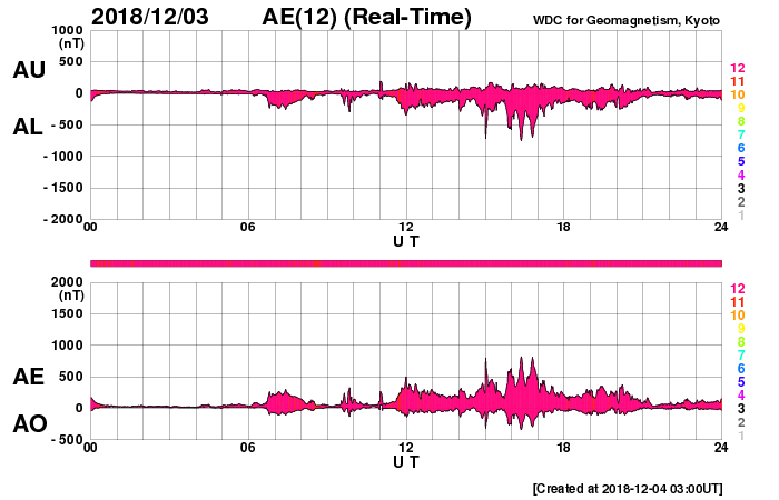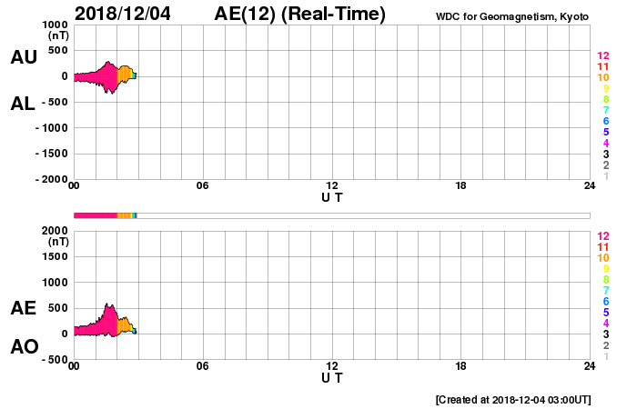 (c) SDO (NASA) ![]() SDO衛星による太陽の可視光写真 (c) SDO (NASA) ![]() DSCOVRが観測した太陽風の磁場(1番上の枠、黒線は全体の強度、赤線は南北成分) および、太陽風の密度(3番目の紫線)、速度(4番目の青線) (c) データ:NOAA/SWPC、作図:宇宙天気ニュース ![]() AE指数(速報値) 下段のAEグラフの値が高くなると、オーロラ活動が活発化しています。 (c) 京都大学WDC ![]() ![]() 27日の太陽周期に合わせたデータプロット 太陽が同じ面を地球に向けていた27日前の変化から、今後を予想することができます。 (c) 作図:宇宙天気ニュース