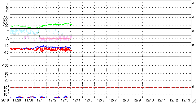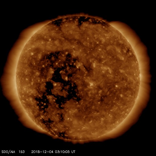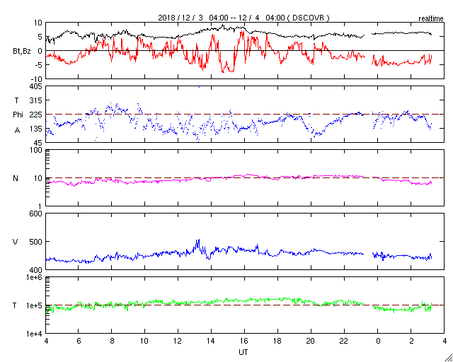2018/12/ 4 12:21 更新 太陽風はやや高速の状態が続いています。 担当 篠原 太陽風の速度は、 昨夜遅くに470km/秒くらいまで高まりましたが、 現在は450km/秒に戻っています。 やや高速の状態は続いていますが、 今回の太陽風の高まりはこの程度で終わりそうです。 太陽風の磁場強度は、5〜6nTと平均的な状態です。 南北成分は、-5nTくらいの南向きが頻繁に発生しています。 このため、磁気圏の活動はやや高まっていて、 AE指数は300nTから700nTにかけて、小中規模の変化が続いています。 SDO衛星AIA193では、 太陽の西半球(右側)のコロナホールは見えなくなり、 東半球(左側)のコロナホールが太陽の中心線まで進んでいます。 現在の太陽風の高まりは終わりを迎え、 3日後くらいから次の太陽風の高まりが始まりそうです。 27日周期の図では、 前周期は11月10日から太陽風の速度が高まっています。 前回は600km/秒まで高まりましたが、今回はどうなるでしょうか。 太陽は、無黒点で穏やかです。