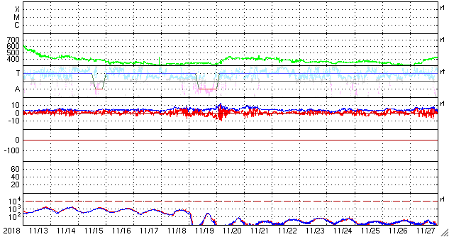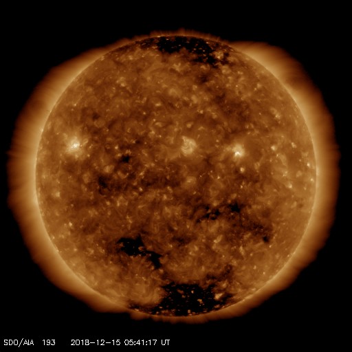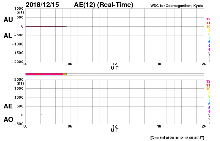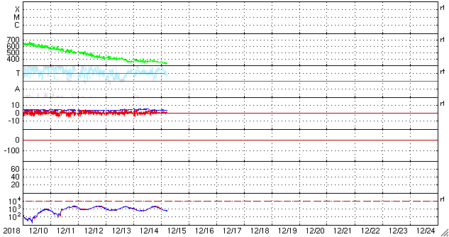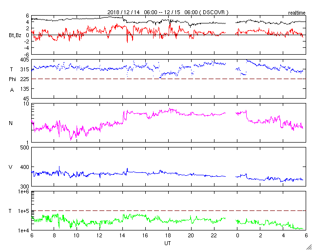 2018/12/15 14:59 更新 太陽風は低速になっています。2731黒点群が見えています。 担当 篠原 太陽風の速度は、330km/秒へ下がって、 更に低速になっています。 磁場強度は、4nT前後と平均的な状態です。 太陽風磁場の南北成分は、弱い北寄りになっています。 AE指数はグラフが出ていませんが、 磁気圏は穏やかに推移している様です。 SDO衛星AIA193では、南半球の中緯度から極域にかけて コロナホールの淡い領域が複雑に分布しています。 前周期は、11月20日に太陽風の弱い高まりが見られた程度でした。 今回はどの様に推移するでしょうか。 太陽では、昨日見え始めた黒点に、 2731黒点群と番号が付けられています。 昨日よりも少しだけ大きくなっていて、 掲載の可視光写真でも見つけることができます。 X線グラフに変化はなく、活動は穏やかです。 ![]() SDO衛星のAIA193カメラによる太陽コロナの様子 (c) SDO (NASA) ![]() SDO衛星による太陽の可視光写真。マウスの矢印を写真に重ねると、黒点番号付きの写真に切り替わります。 (c) SDO (NASA) ![]() DSCOVRが観測した太陽風の磁場(1番上の枠、黒線は全体の強度、赤線は南北成分) および、太陽風の密度(3番目の紫線)、速度(4番目の青線) (c) データ:NOAA/SWPC、作図:宇宙天気ニュース ![]() AE指数(速報値) 下段のAEグラフの値が高くなると、オーロラ活動が活発化しています。 (c) 京都大学WDC ![]() ![]() 27日の太陽周期に合わせたデータプロット 太陽が同じ面を地球に向けていた27日前の変化から、今後を予想することができます。 (c) 作図:宇宙天気ニュース