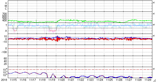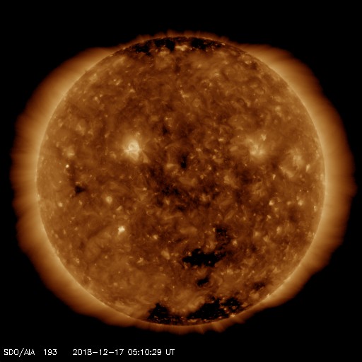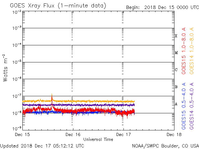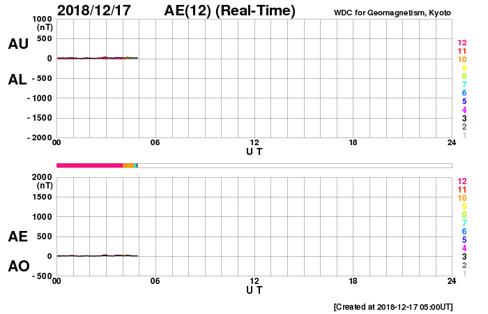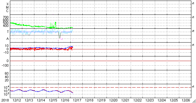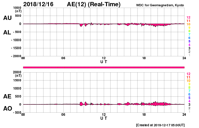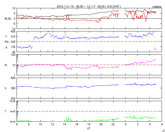 2018/12/17 14:19 更新 太陽風は低速の状態が続いています。イエローナイフの流星とオーロラをどうぞ。 担当 篠原 高坂雄一さんより、カナダ・イエローナイフで撮影された ふたご座流星群の様子と、オーロラの写真をいただきました。 初めの2枚は、ふたご座流星群の流星です。 1枚目はおうし座に沿って流れています。 ちょうどおうし座を通過中のウィルタネン彗星が、 流星の中ほどのすぐ上にぼんやりと見えています。 撮影時刻はメールに書かれていなかったのですが、 彗星の位置から考えると現地14日の早朝(世界時14日昼頃)の様です。 2枚目は、オーロラの淡い帯を背景に、 右に明るい流星、左に暗い流星と2個写っています。 明るい流星の左下には、下方通過中のこと座が見えています。 高坂さんによると、流星は200個ほど見られたそうで、 明るく輝く大火球も3つ見えたそうです。 また、3〜4枚目は、現地16日1時半(世界時16日8時半)に、 1分ほど現れたオーロラのプチ爆発とのことです。 太陽風の速度は300km/秒と遅く、 南北磁場も0nT付近と条件はかなり厳しかった様ですが、 こんな活動が見られたとのことです。 ふたご座流星群は、高坂さんの撮影と同じ頃(日本時間14日夜)に、 私も学校の屋上で天文同好会の学生たちと観望していました。 200個には遙か遠く及びませんが、きれいな流星たちを眺めることができました。 きれいな写真をどうもありがとうございます。 太陽の南半球で昨日見られた第25期の性質を持つ磁場の並びは、 今日も見えています(5枚目の図)。 可視光写真では黒点は見えていません。 この領域は、このまま消えていきそうです。 2731黒点群も見えなくなっていて、太陽は無黒点です。 太陽風は、磁場強度が7nTに少し高まり、 速度は低速ですが、300km/秒から330km/秒に少し上がっています。 27日周期の図の前周期の変化が回帰している様です。 前周期の速度は400km/秒まで高まっていますが、 今回はどうなるでしょうか。 太陽風磁場の南北成分は、グラフの前半は弱い南寄りで、 後半は北向きになっています。 AE指数も、16日は小さい変化が見えていますが、 17日に入ると変化がなくなっています。 AE指数の図の16日8時半の小さい高まりは、 高坂さんがオーロラを撮影した頃の変化です。