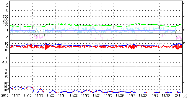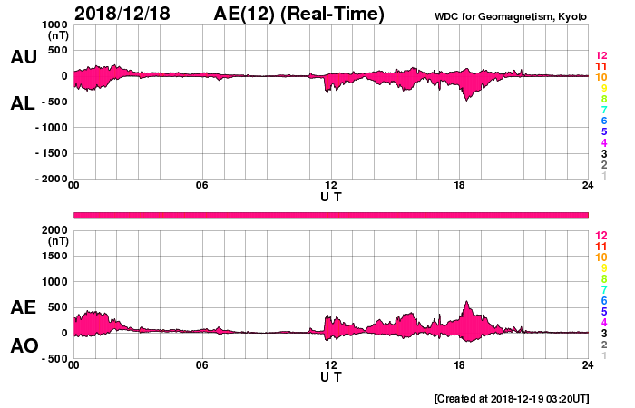 下段のAEグラフの値が高くなると、オーロラ活動が活発化しています。