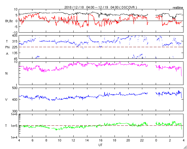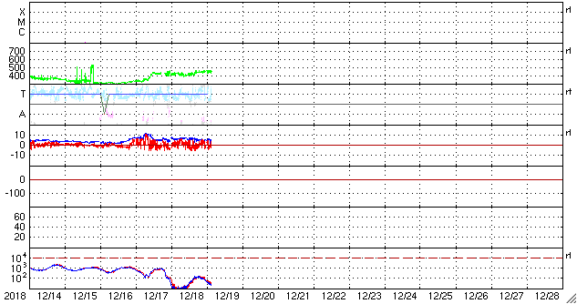 - 2018/12/18 11:37 太陽風は平均的な速さになり、磁気圏も小規模の活動が見られています。