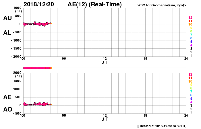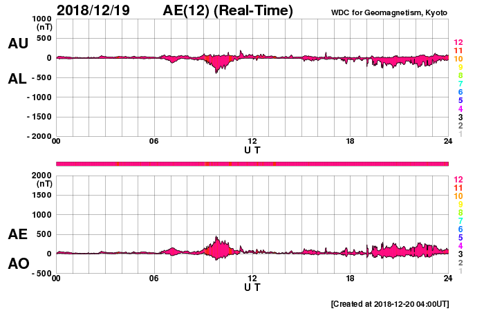 下段のAEグラフの値が高くなると、オーロラ活動が活発化しています。