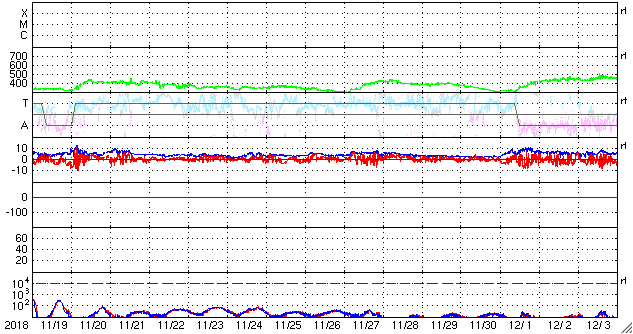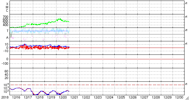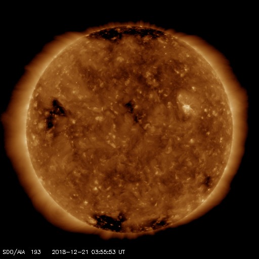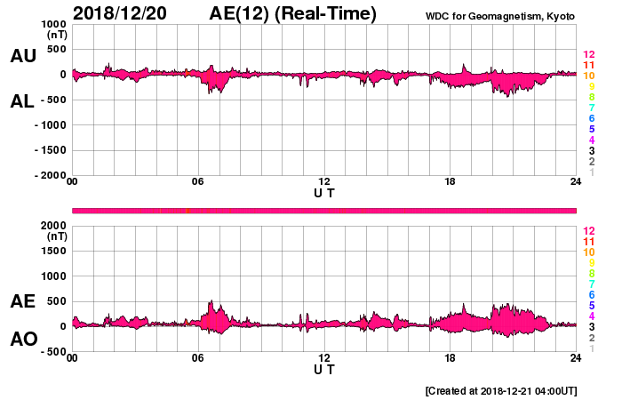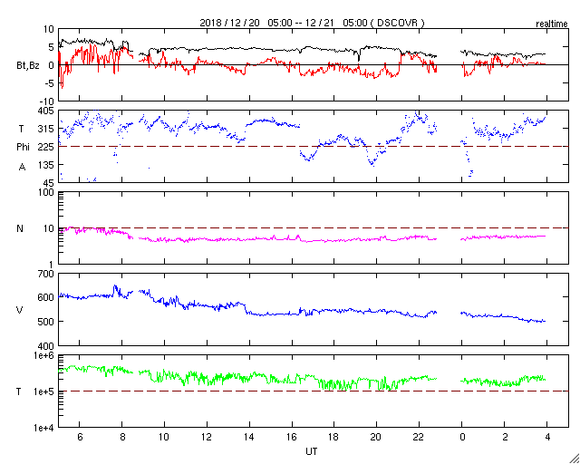 2018/12/21 13:02 更新 太陽風の速度は500km/秒に下がりましたが、高速の状態は続いています。 担当 篠原 太陽風の速度は、昨日の夕方まで600km/秒を保ちました。 その後ゆっくりと下がり、現在は500km/秒です。 高速の状態は続いています。 太陽風の磁場強度は、3nTに下がってやや弱くなっています。 太陽風の高まりはピークを過ぎた様ですが、 27日周期の図で前周期と比較すると、立派な高まりになりました。 太陽風磁場の南北成分は、0nT付近で南北に変化しています。 磁気圏では小規模の活動が続いていて、 AE指数は300〜500nTの小規模の変化が頻繁に発生しています。 この後、太陽風の速度が下がって行くと、 磁気圏の活動も小さくなって行くでしょう。 SDO衛星AIA193の太陽コロナ写真では、 太陽の中央部にコロナホールは特に見られず、 この後、太陽風はしばらく穏やかになりそうです。 太陽は、無黒点が続いています。 ![]() SDO衛星のAIA193カメラによる太陽コロナの様子 (c) SDO (NASA) ![]() SDO衛星による太陽の可視光写真 (c) SDO (NASA) ![]() DSCOVRが観測した太陽風の磁場(1番上の枠、黒線は全体の強度、赤線は南北成分) および、太陽風の密度(3番目の紫線)、速度(4番目の青線) (c) データ:NOAA/SWPC、作図:宇宙天気ニュース ![]() AE指数(速報値) 下段のAEグラフの値が高くなると、オーロラ活動が活発化しています。 (c) 京都大学WDC ![]() ![]() 27日の太陽周期に合わせたデータプロット 太陽が同じ面を地球に向けていた27日前の変化から、今後を予想することができます。 (c) 作図:宇宙天気ニュース