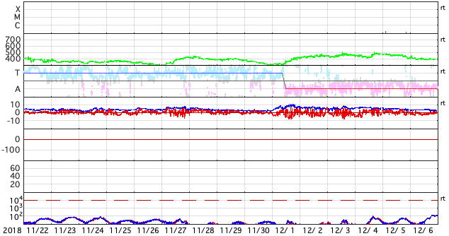 2018/12/22 11:16 太陽風は平均的な速度に戻りました。磁気圏は穏やかです。