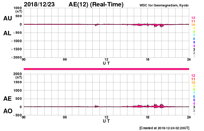 下段のAEグラフの値が高くなると、オーロラ活動が活発化しています。