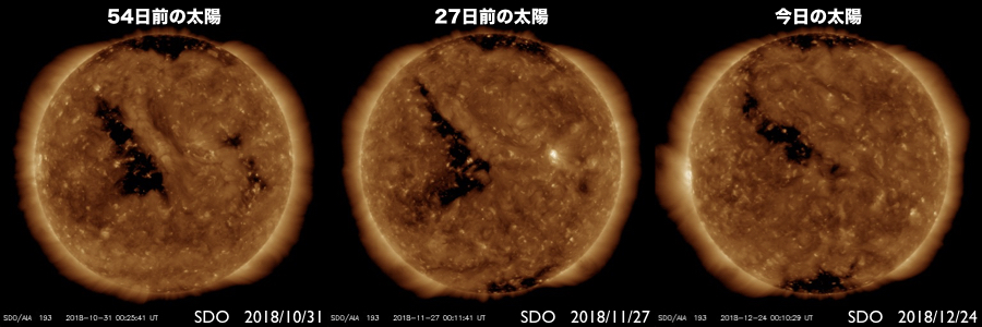 2周期前(54日前)、1周期前(27日前)、現在のコロナホールの様子。SDO衛星AIA193。