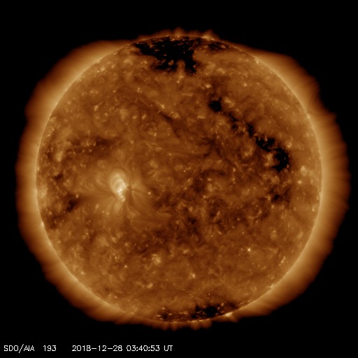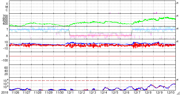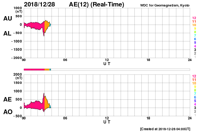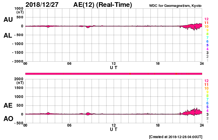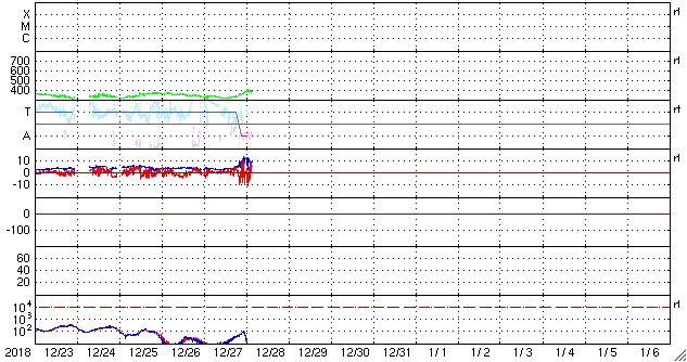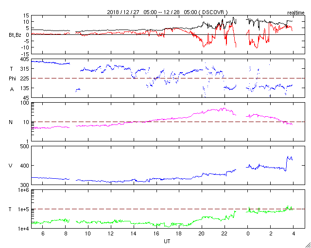 2018/12/28 13:02 更新 太陽風の高まりが到来しています。磁気圏の活動も高まっています。 担当 篠原 昨夜遅くから太陽風の変化が到来しています。 今朝、28日8時(世界時27日23時)頃に、磁場強度が10nTに強まり、 少し遅れて、速度も400km/秒と平均的な速さに達しました。 その後、磁場強度と速度はゆっくりと下がりかけていましたが、 グラフの最後に、速度は430km/秒へ高まり、 磁場強度は再び10nTに達する変化が見えています。 27日周期の図で、前周期の12月1日に始まった変化が、 半日ほど早まって到来した様です。 速度や磁場の高まり方は、前周期と同じくらいになっています。 太陽風磁場の南北成分は、 磁場の強まり始めた頃は南寄りになって、 -10nTに達する大きな変化も発生しています。 このため磁気圏の活動が強まり、 AE指数では800nTに達する中規模の変化が発生しています。 ただ、速度は特に高まっていないため、 磁気圏の変化の規模はこの程度に留まっている様です。 太陽風のグラフの最後では、磁場は北寄りに傾向が変わっています。 このため、磁気圏の活動は一旦弱まりそうです。 この後も北寄りの状態が続くか、再び南寄りに傾向が変わるかで、 磁気圏の活動度は大きく変わります。 太陽は今日も無黒点です。 2週間ほど無黒点が続いています。 今月の無黒点日の日数は、25日近くになりそうです。