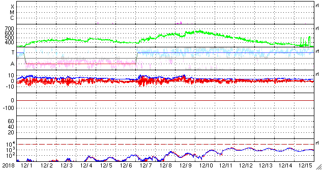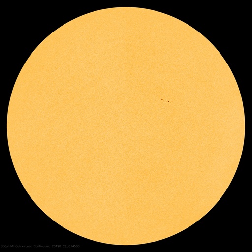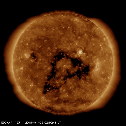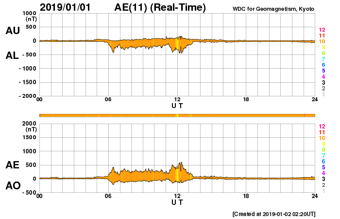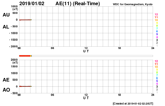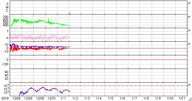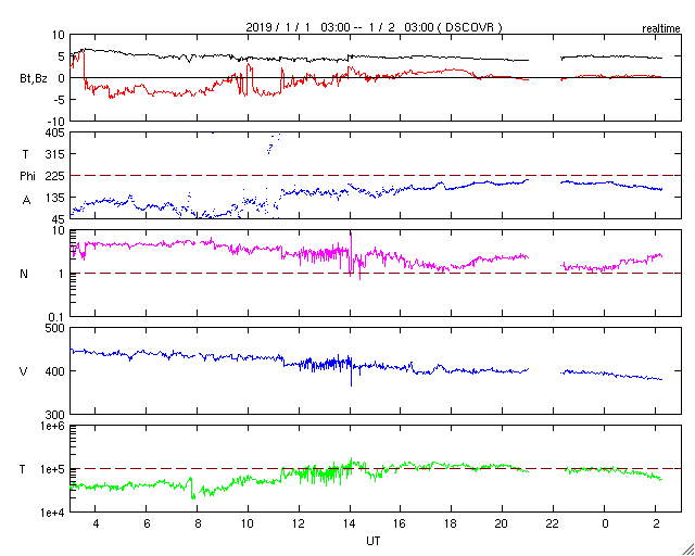 2019/ 1/ 2 11:26 更新 太陽に2732黒点群が発生しています。太陽風はやや低速になっています。 担当 篠原 太陽の中央部の北西側(右上)に黒点が現れました。 一昨日くらいから小さく見えていた領域です。 2732黒点群と番号も付けられ、2019年第1号の黒点群になりました。 磁場の並びは、現在の第24活動周期の順番です。 太陽風は、380km/秒まで速度が下がり、 やや低速になっています。 磁場強度は、5nTと平均的な状態が続いています。 磁場の南北成分は、 DSCOVR衛星のグラフの前半で南寄りが続き、 AE指数で300〜500nTの小規模の変化が発生しています。 以降は、磁場は0nT付近になり、磁気圏も静かになっています。 SDO衛星AIA193では、 三角形に広がるコロナホールの先頭(右端)が、 太陽の西側(右側)に半分ほど進み、 地球へ影響が及び始める目安の位置に近付いています。 27日周期の図の前周期、 12月7日以降に見られる様な太陽風の高まりが、 明日くらいから始まりそうです。 磁場強度が強まって、南向きに変化する様になると、 磁気圏の活動も活発化します。 太陽風の変化が始まったら、 オーロラのライブカメラなどに注目してください。