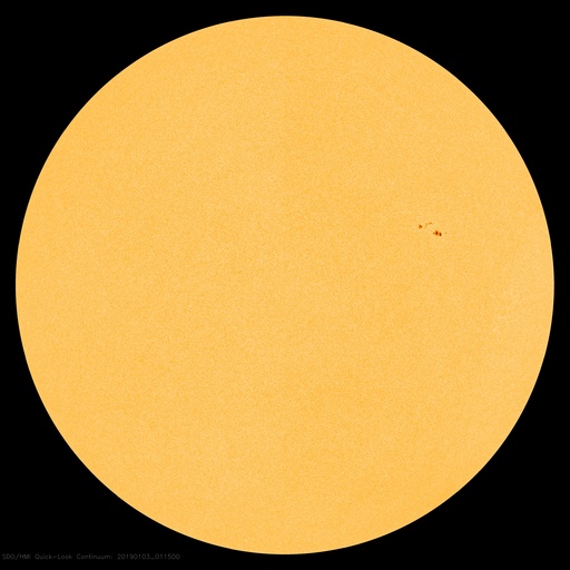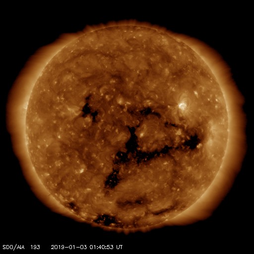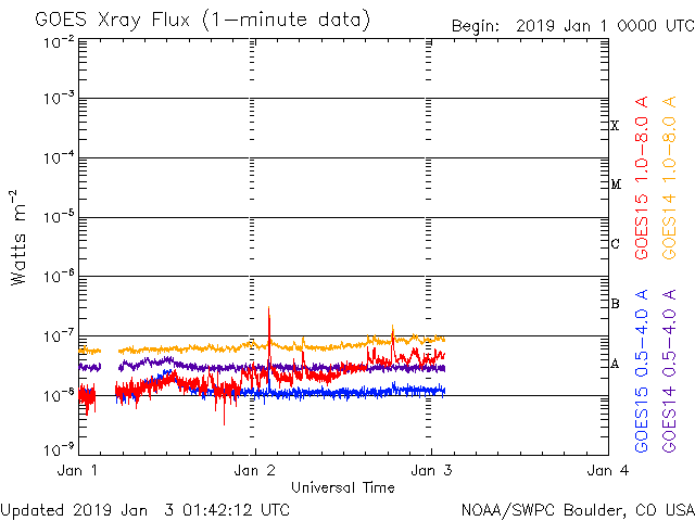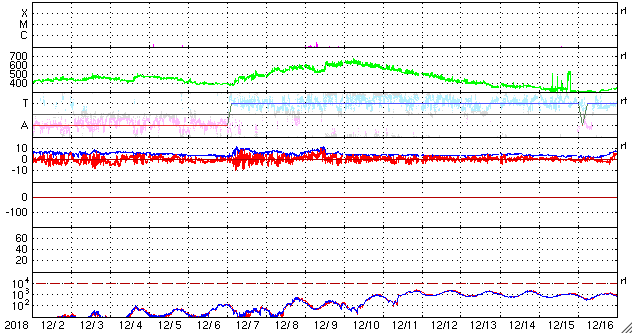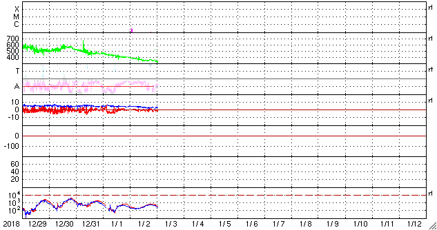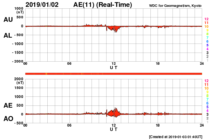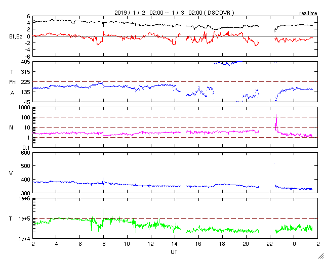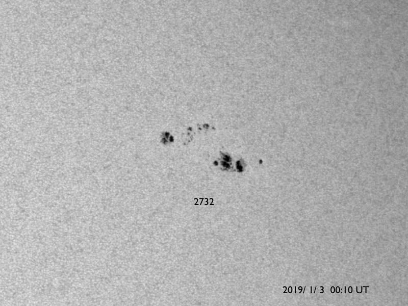 2019/ 1/ 3 10:50 更新 2732黒点がより大きくなっています。これから太陽風の高まりが始まりそうです。 担当 篠原 2732黒点群は更に大きくなっています。 SDO衛星による可視光の拡大写真を掲載します。 X線グラフでは、Bクラスに達する小さい変化も発生しています。 太陽風は、330km/秒まで速度が下がり、 低速の風になっています。 磁場強度も3nTとやや弱くなっています。 磁気圏は穏やかで、 AE指数のグラフでは、300nTの変化が1回発生していますが、 その他は目立った変化はありません。 SDO衛星AIA193では、コロナホールが西に進み、 影響の到来が近付いています。 27日周期の図の前周期のグラフは、 ちょうど速度や磁場強度が高まり始める頃です。 今後の太陽風の推移に注目してください。 太陽風の磁場が南向きに大きく変化する様になると、 オーロラの活動も一気に高まるでしょう。