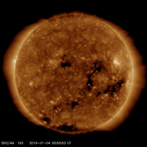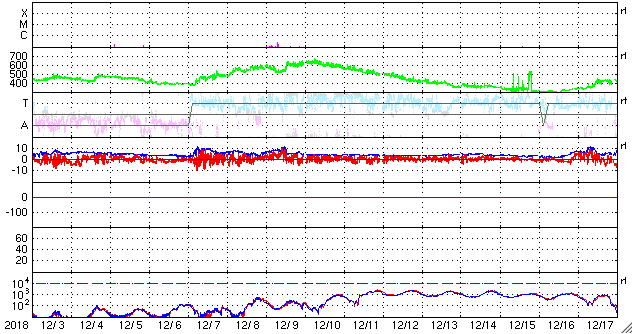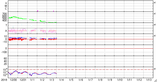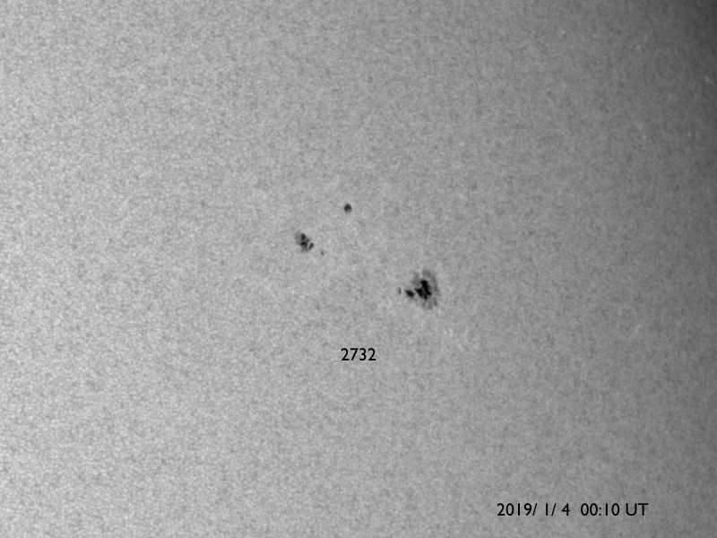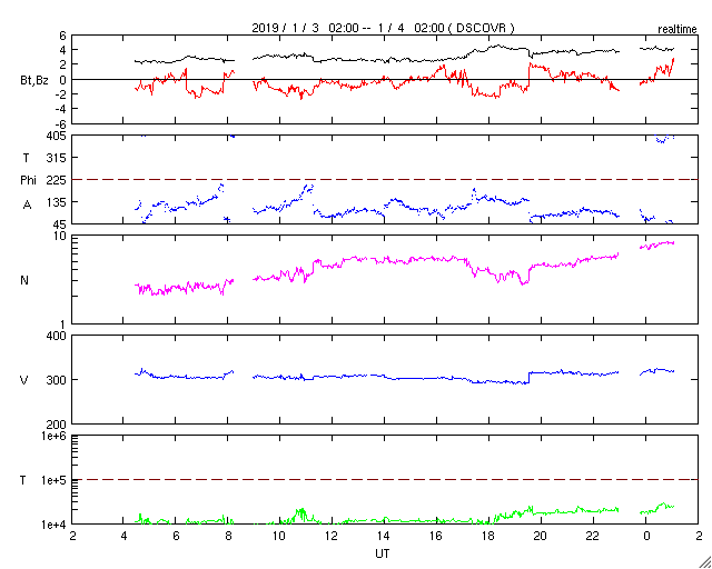 2019/ 1/ 4 10:17 更新 太陽風は300km/秒と低速の状態が続いています。 担当 篠原 太陽風は、300〜310km/秒と低速の状態が続いています。 磁場強度も、3nTから4nTに少し上がっていますが、 やや弱い状態が続いています。 コロナホールの影響はまだ到来していません。 27日周期の図を参照すると、 前周期の変化の始まり(12月7日)から1日ほど経過しています。 27日周期というのは目安の数字なので、 変化のタイミングが前後することは普通に見られることです。 一方、SDO衛星AIA193の太陽コロナ写真を見ると、 コロナホールの先頭(右端)は太陽の西の端近くまで進んでいて、 太陽風の高まりはそろそろ始まるのではないかと思います。 太陽風の磁場強度が更に強まって行く様であれば、 変化の到来と考えられるでしょう。 磁気圏は静穏です。 AE指数は、時々小さい変化が起きている程度です。 太陽の2732黒点群は、少し小さくなっています。 X線グラフでは、Bクラスの小さい変化も起きていますが、 変化の高まりとしてはピークを越えている様子です。 ![]() 2732黒点群の拡大写真。SDO衛星。 (c) SDO (NASA)、作図:宇宙天気ニュース ![]() SDO衛星のAIA193カメラによる太陽コロナの様子 (c) SDO (NASA) ![]() SDO衛星による太陽の可視光写真。マウスの矢印を写真に重ねると、黒点番号付きの写真に切り替わります。 (c) SDO (NASA) ![]() DSCOVRが観測した太陽風の磁場(1番上の枠、黒線は全体の強度、赤線は南北成分) および、太陽風の密度(3番目の紫線)、速度(4番目の青線) (c) データ:NOAA/SWPC、作図:宇宙天気ニュース ![]() AE指数(速報値) 下段のAEグラフの値が高くなると、オーロラ活動が活発化しています。 (c) 京都大学WDC ![]() ![]() 27日の太陽周期に合わせたデータプロット 太陽が同じ面を地球に向けていた27日前の変化から、今後を予想することができます。 (c) 作図:宇宙天気ニュース