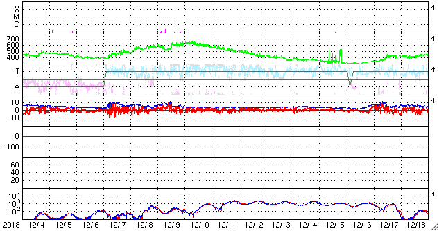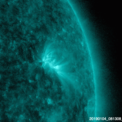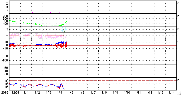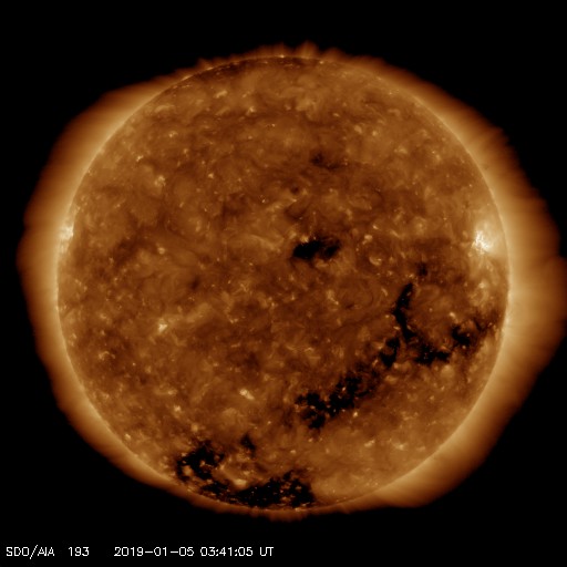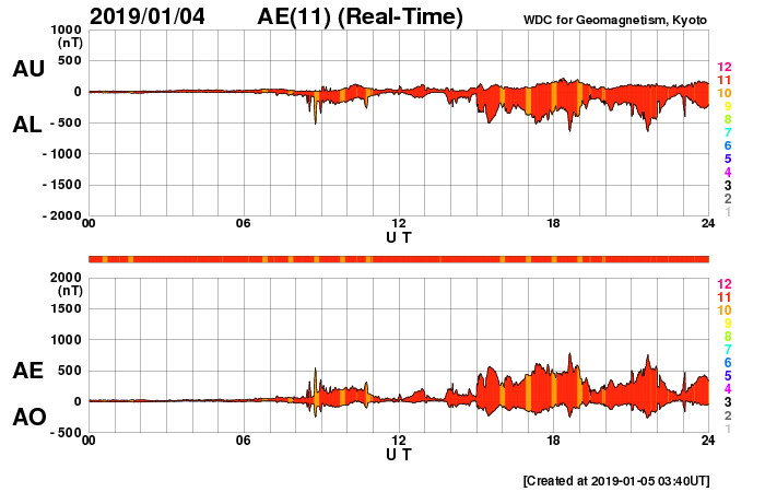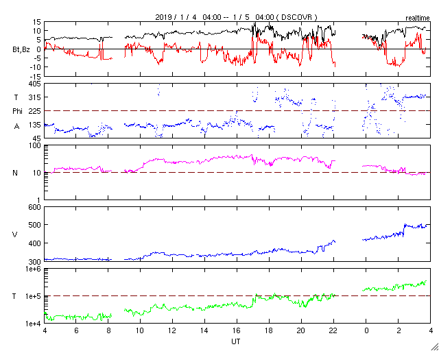2019/ 1/ 5 12:55 更新 太陽風の速度は500km/秒近くに高まっています。磁気圏の活動も高まっています。 担当 篠原 太陽風は、昨夜から変化が始まっています。 磁場強度は5〜10nTとやや強まった状態になり、 速度は300km/秒から400km/秒に高まって、 低速風から平均的な速さに変わっています。 更に、グラフの最後で速度が500km/秒近くに高まっています。 このまま、高速の太陽風が始まりそうです。 27日周期の図を見ると、 変化は前周期よりも1〜2日遅れて始まっています。 前周期は、この後、600km/秒まで速度が高まりましたが、 今回はどうなるでしょうか。 引き続き、太陽風の変化に注目して下さい。 太陽風磁場の南北成分は、 南向きに -5nTを超える変化が頻繁に発生しています。 このため、磁気圏の活動も高まっていて、 AE指数は、500nTに達する中規模の変化が半日ほど続いています。 太陽風磁場の強まりが続いていて、速度も高まってきたので、 今後も南寄りの傾向が続けば、 磁気圏の活動は一段と活発になる可能性があります。 太陽では、2732黒点群でB4.2の小さいフレアが発生しています。 SDO衛星AIA131、193による動画を掲載します。 黒点としては、昨日よりも小さくなっています。 ![]() 2732黒点群で発生したB4.2の小さいフレア。SDO衛星AIA131、193。 (c) SDO (NASA)、(動画加工 : 宇宙天気ニュース) ![]() SDO衛星のAIA193カメラによる太陽コロナの様子 (c) SDO (NASA) ![]() SDO衛星による太陽の可視光写真。マウスの矢印を写真に重ねると、黒点番号付きの写真に切り替わります。 (c) SDO (NASA) ![]() DSCOVRが観測した太陽風の磁場(1番上の枠、黒線は全体の強度、赤線は南北成分) および、太陽風の密度(3番目の紫線)、速度(4番目の青線) (c) データ:NOAA/SWPC、作図:宇宙天気ニュース ![]() AE指数(速報値) 下段のAEグラフの値が高くなると、オーロラ活動が活発化しています。 (c) 京都大学WDC ![]() ![]() 27日の太陽周期に合わせたデータプロット 太陽が同じ面を地球に向けていた27日前の変化から、今後を予想することができます。 (c) 作図:宇宙天気ニュース